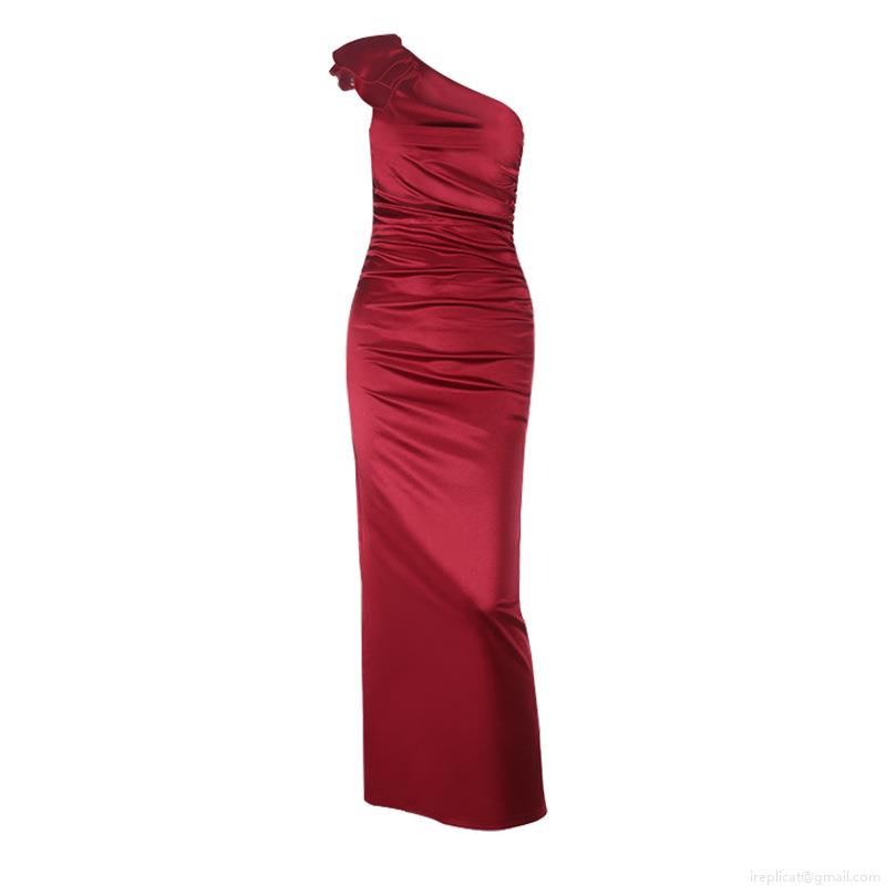 Women Sexy One Shoulder Satin Party Evening Dress Elegant Ruched Pleated Bodycon Maxi Gown For Banquet Prom Cocktail 95% Polyester 5% Spandex