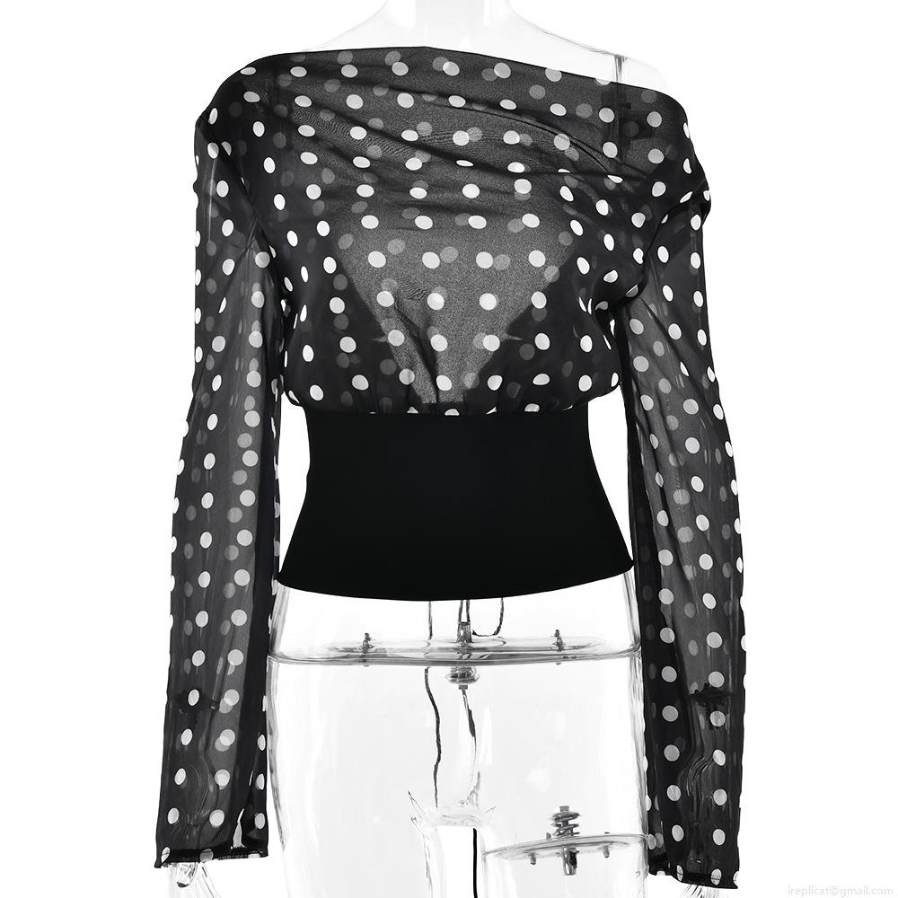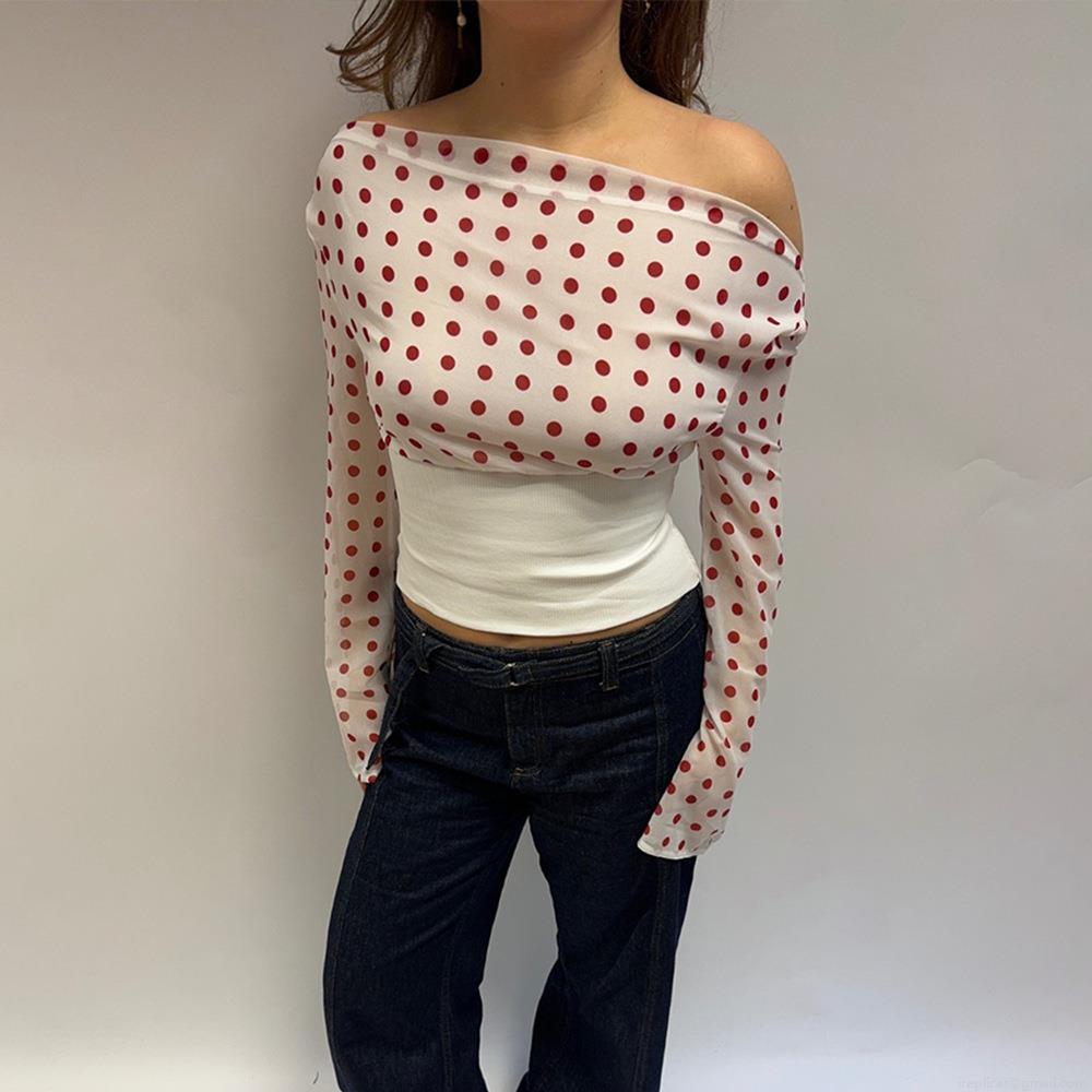 Women Sexy Polka Dot Chiffon Top One Shoulder Long Mesh Sleeve Backless Lace Up Crop Top Y2K Streetwear Clubwear Shirt