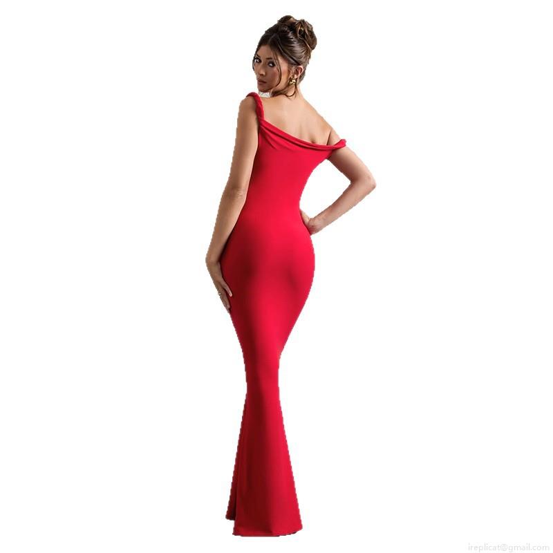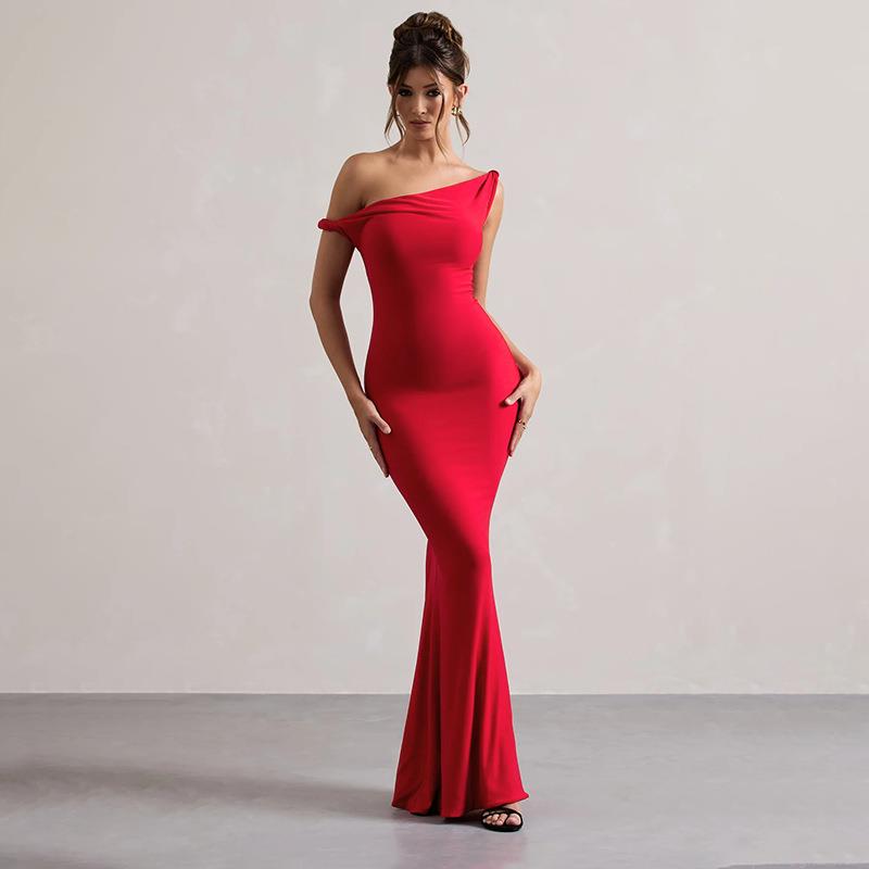 Women Sexy Red One Shoulder Knot Mermaid Evening Dress Elegant Bodycon Fishtail Maxi Gown For Wedding Party Celebration
