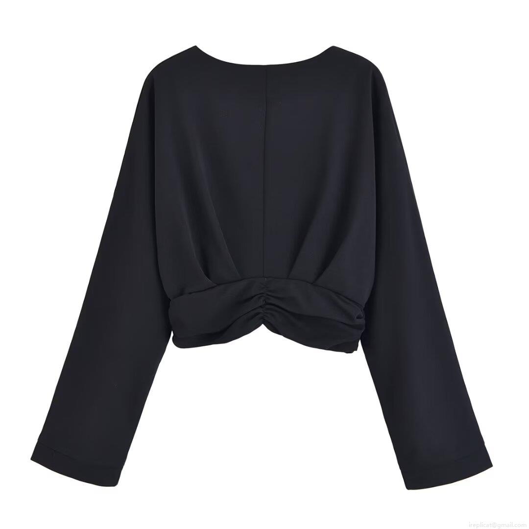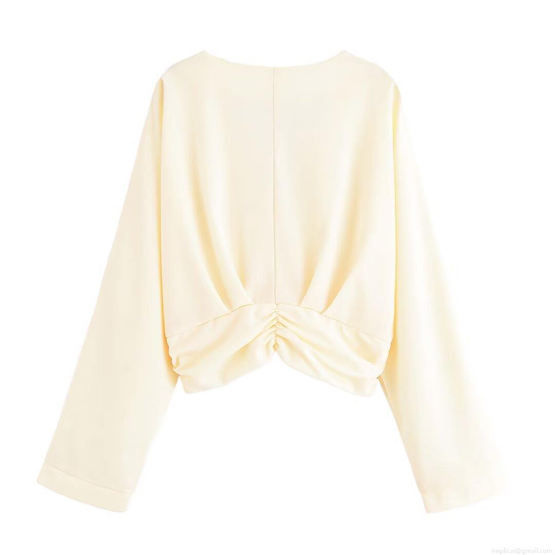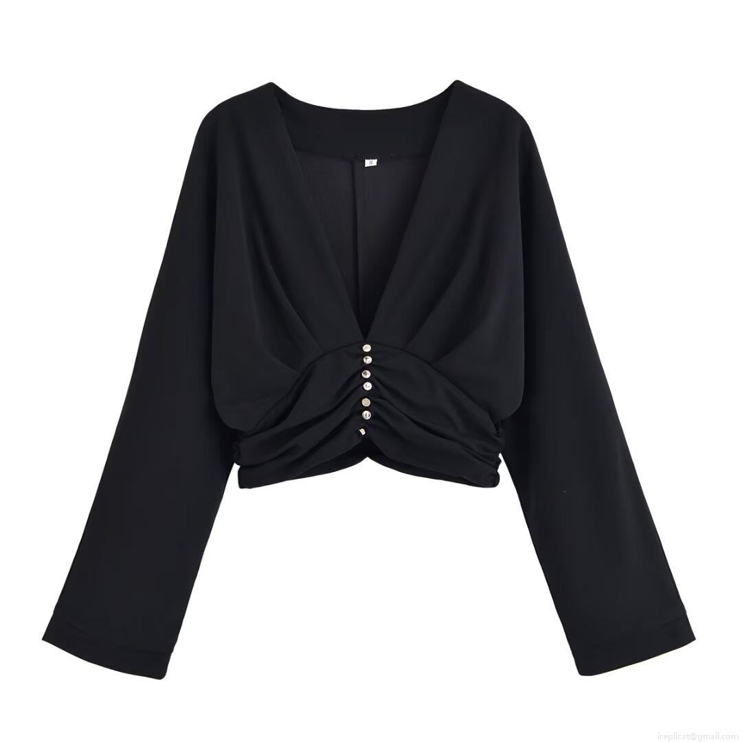 Women Sexy Ruched V-Neck Long Sleeve Crop Top Polyester Button Front Solid Color Slim Fit Streetwear Fashion T-Shirt For Party Daily Club Wear