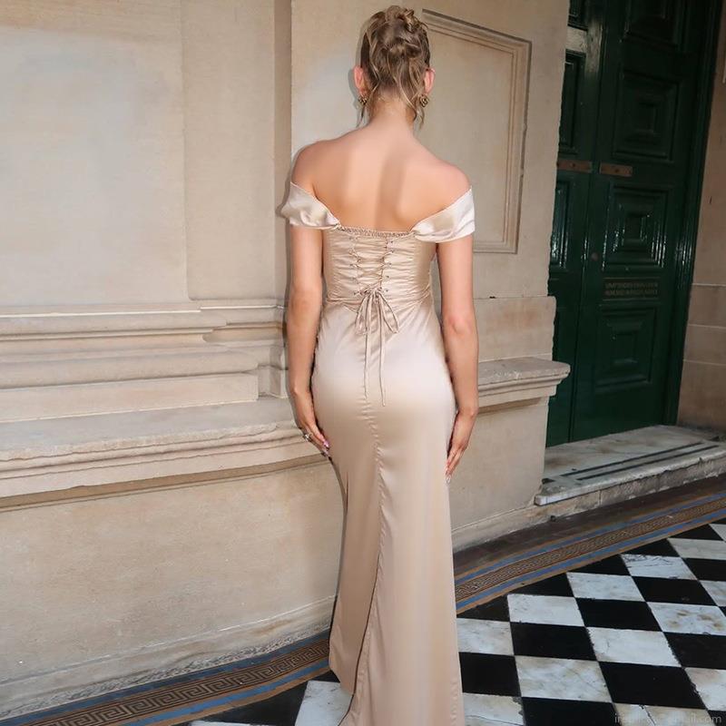 Women Sexy Satin Maxi Dress Backless Lace-up Off Shoulder Ruched High Slit Elegant Party Evening Gown Floor Length Bodycon Summer Solid Color Dress