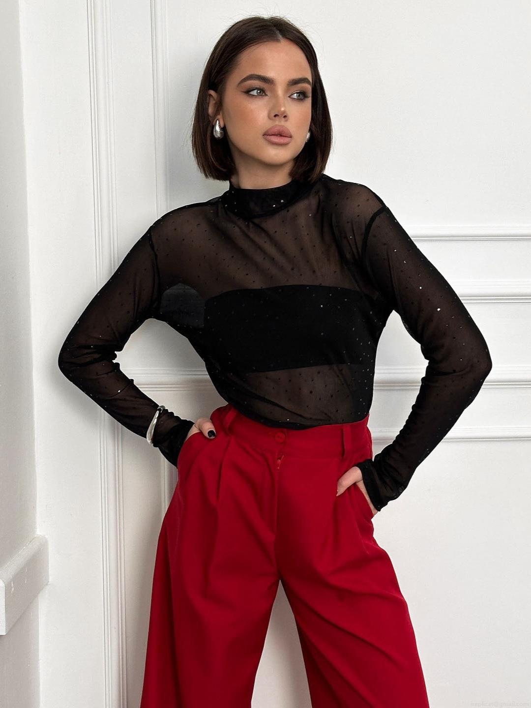 Women Sexy See-Through Black Mesh Long Sleeve T-Shirt With Rhinestones Elegant Slim Fit Sheer Top For Party Clubwear Streetwear Y2K Fashion