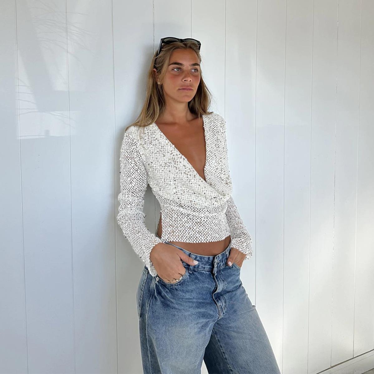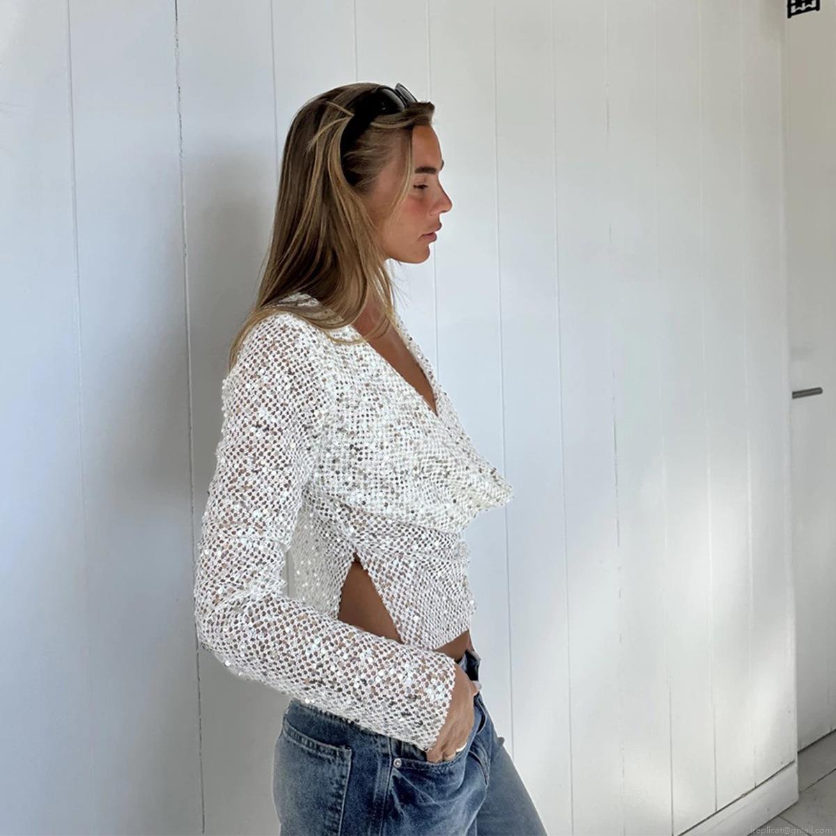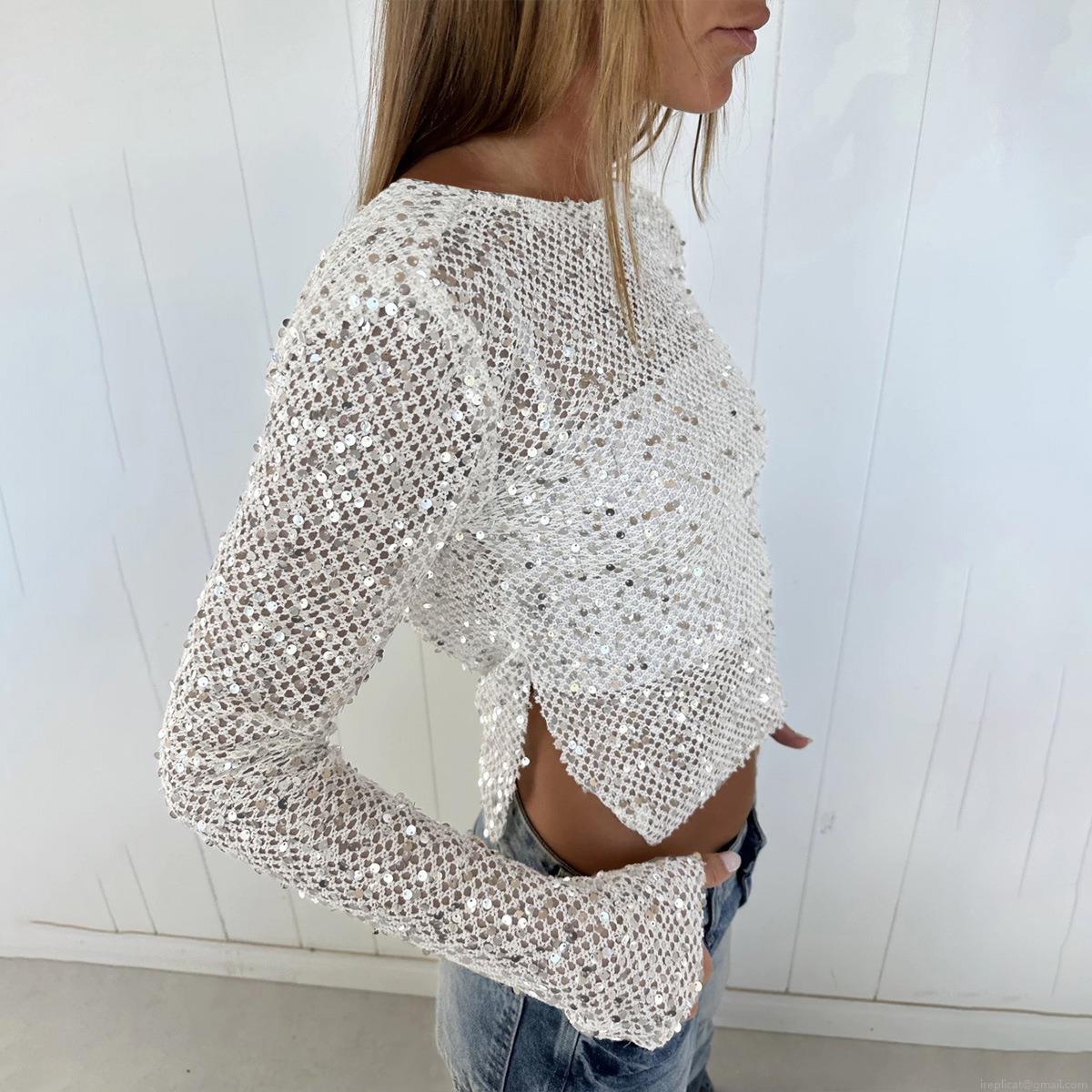 Women Sexy Sequin Mesh Hollow Out Cowl Neck Long Sleeve T-Shirt Shiny Sheer Cropped Top Streetwear Clubwear Party Blouse