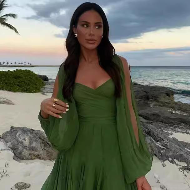 Solid Color, Waist shaping, V-neck, Lace, Off-shoulder, Slit Sleeves