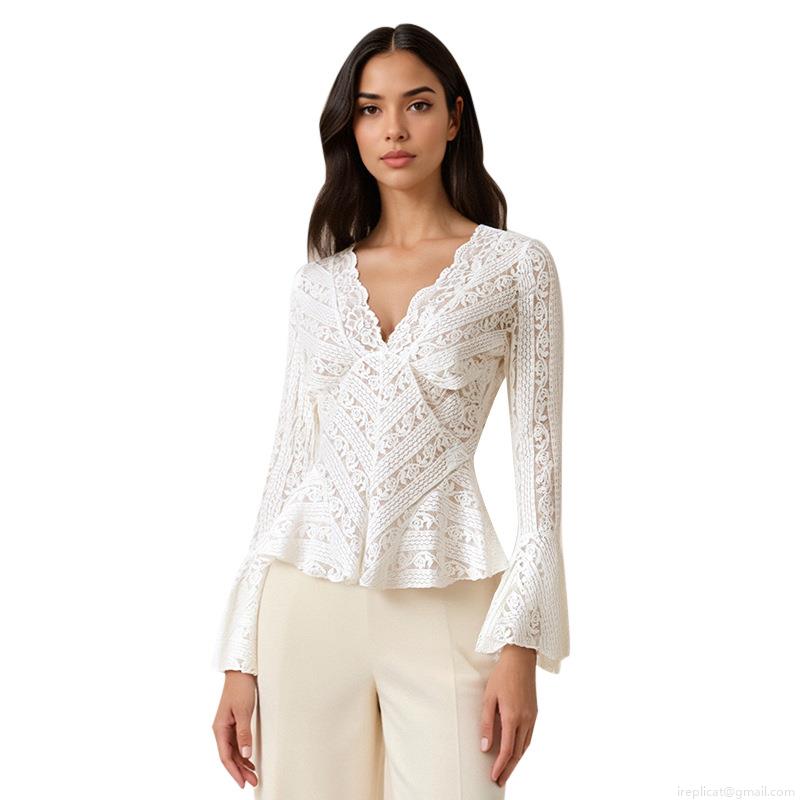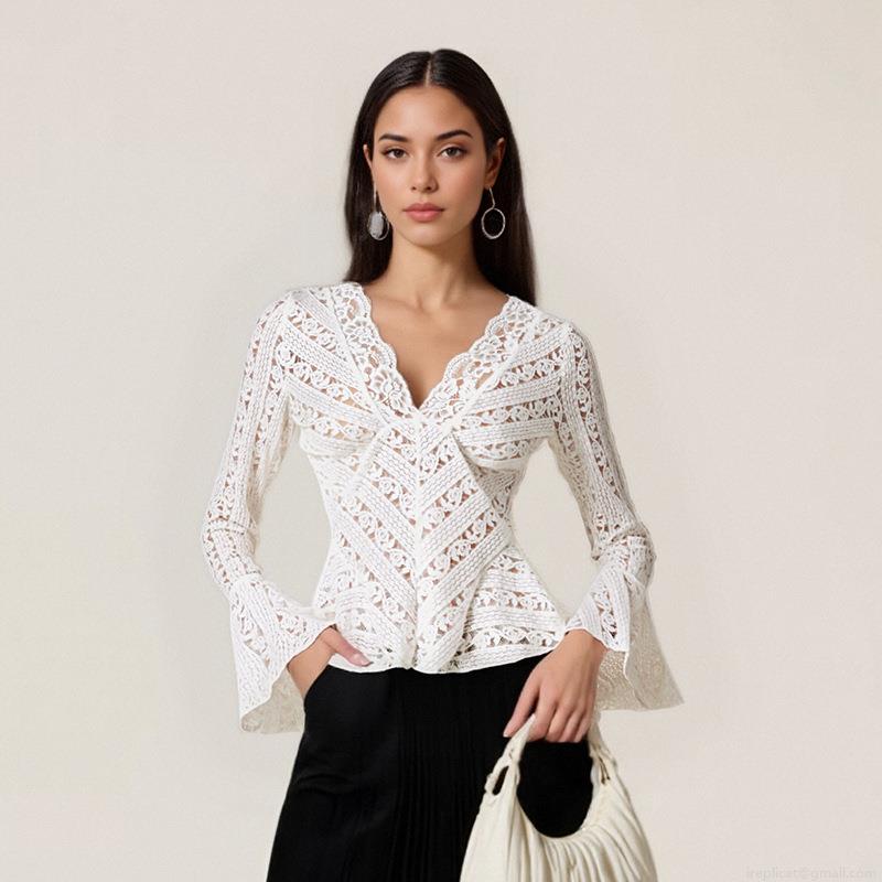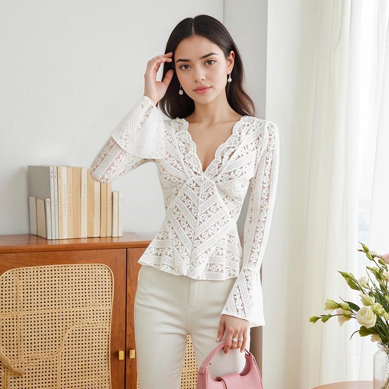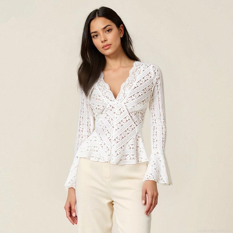 Women Sexy V Neck Lace T-Shirt Hollow Out Floral Flare Long Sleeve Slim Fit Short Top Elegant White Streetwear Blouse For Ladies