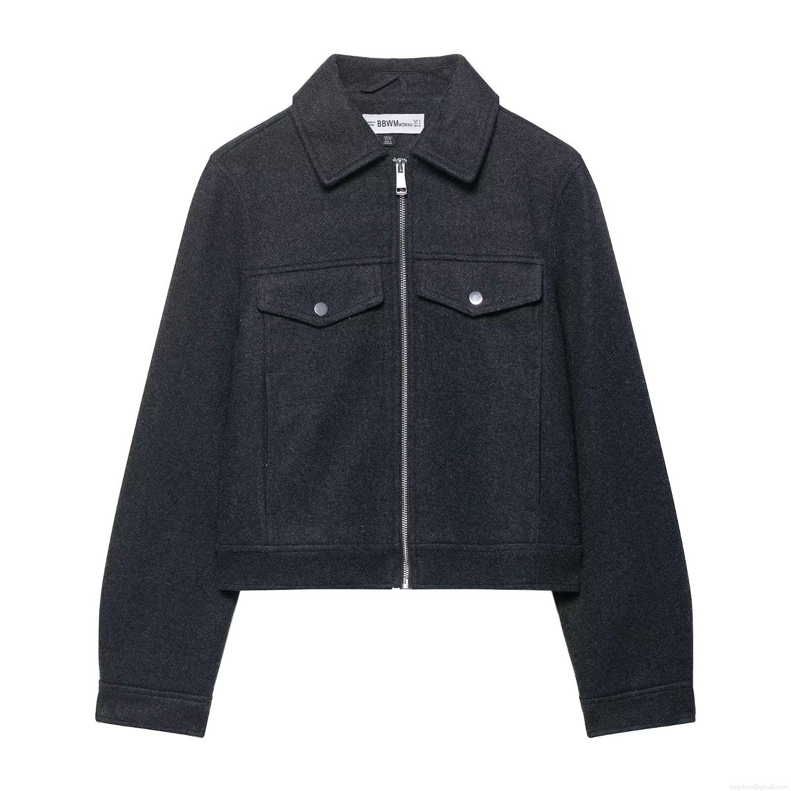 Women Short Lapel Woolen Texture Jacket Casual Long Sleeve Zipper Outwear With Chest Pockets Solid Color Autumn Fashion Baseball Uniform Coat For Ladies Streetwear