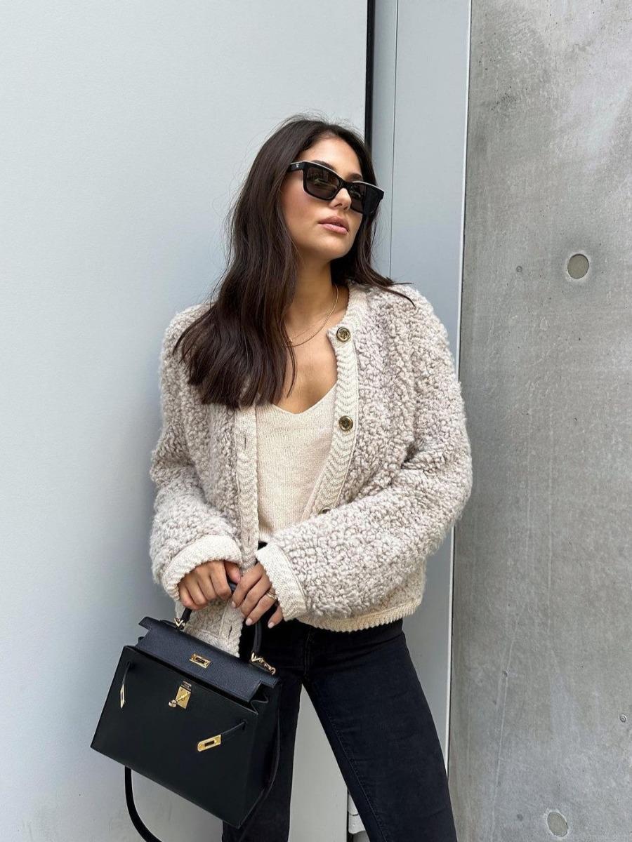 Women Small Fragrance Style Knitted Cardigan Solid Color Lamb Wool Fleece Jacket Metal Buttons For Autumn Winter Streetwear Ladies Outerwear