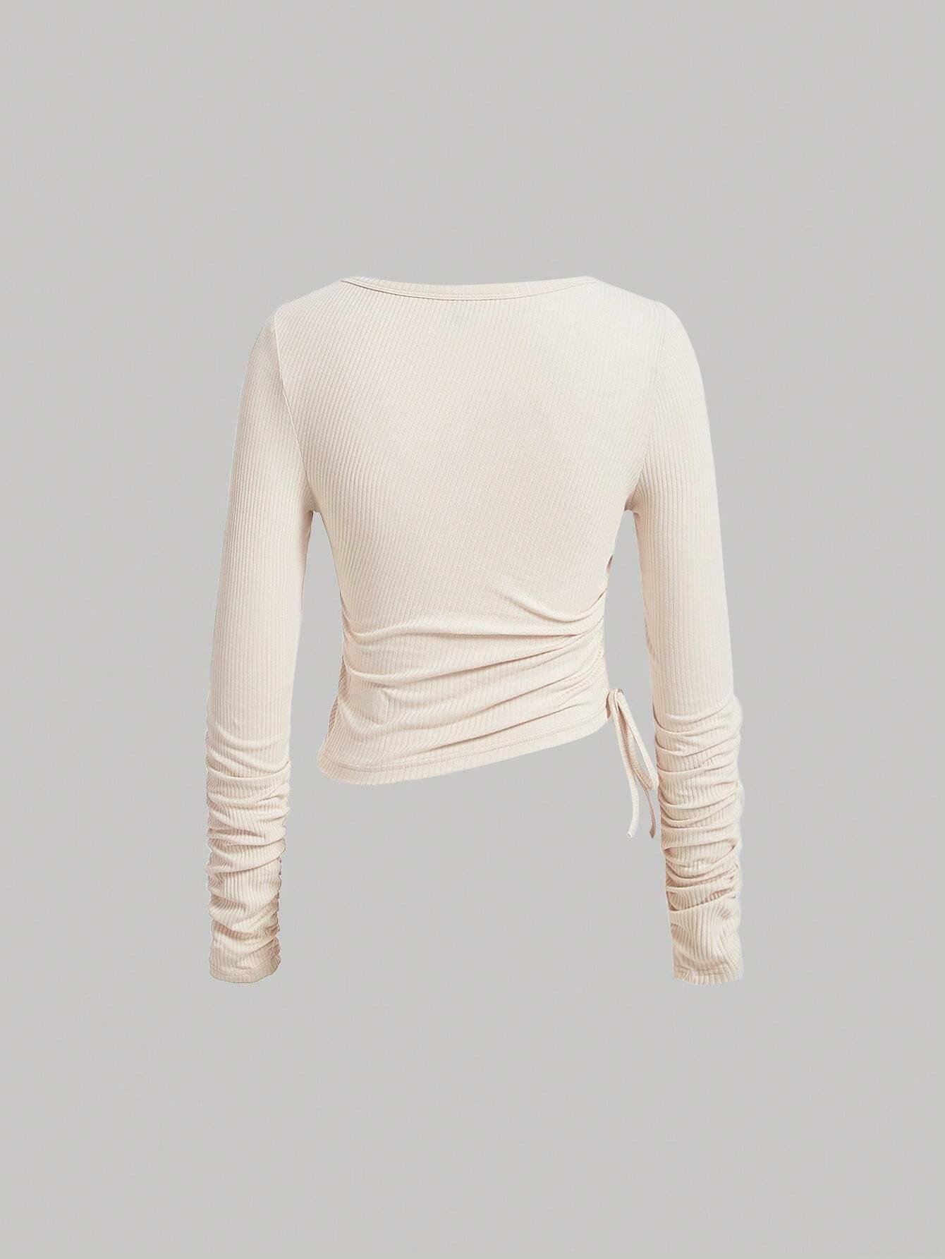 Women Square Neck Long Sleeve T-Shirt Ribbed Knit Side Drawstring Ruched Slim Fit Viscose Spandex Casual Base Layer Cropped Top