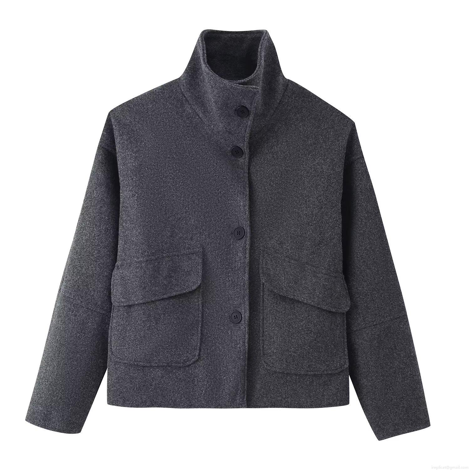 Women Stand Collar Woolen Look Short Jacket Single Breasted Solid Color Long Sleeve Coat With Large Pockets Autumn Winter Casual Streetwear Outwear Fashion Outerwear