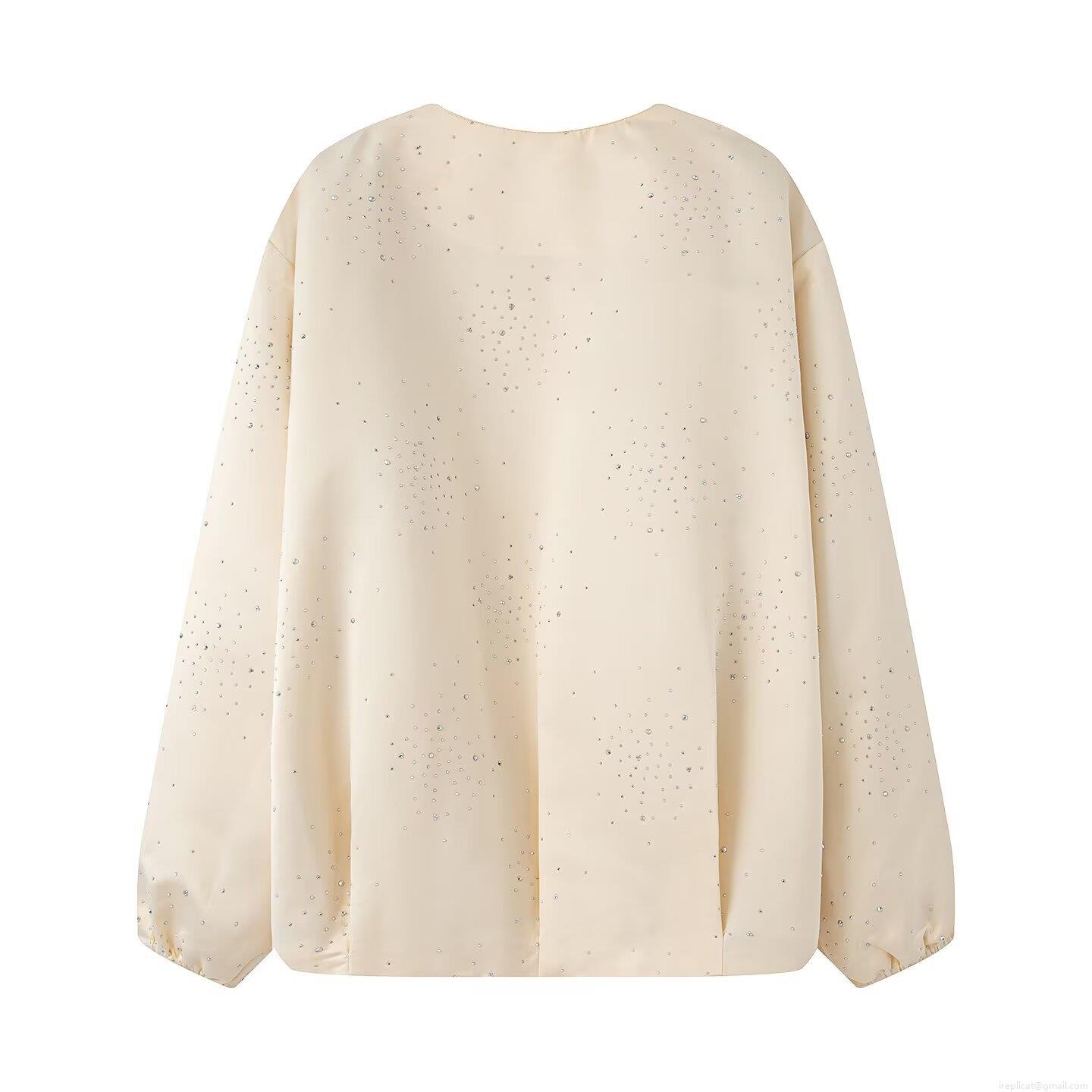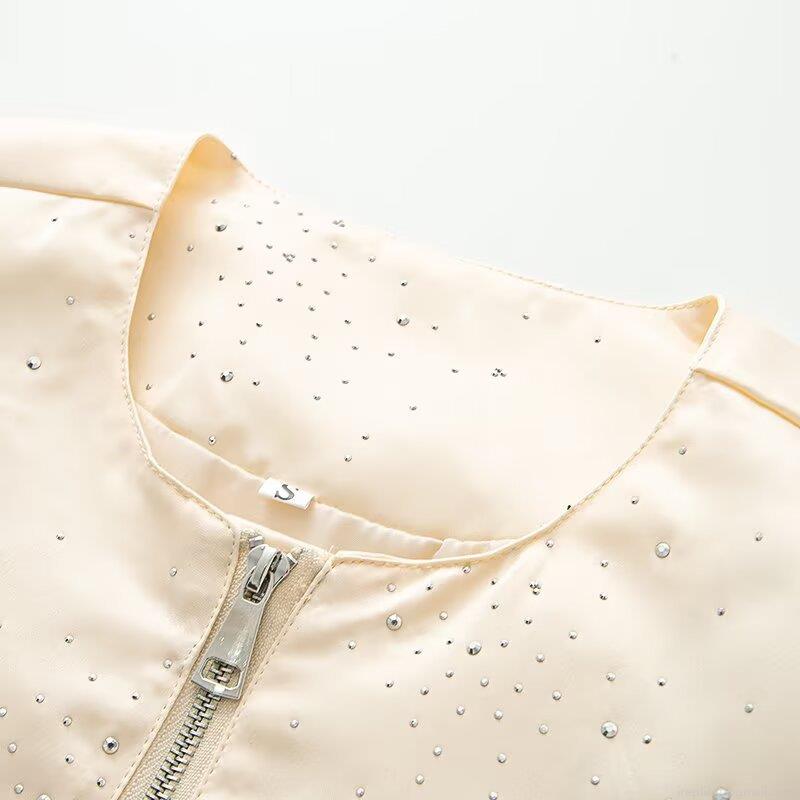 Women Street Fashion Rhinestone Bomber Jacket Solid Color Round Neck Long Sleeve Zip Up Casual Coat With Elastic Hem Soft Polyester Outwear For Ladies
