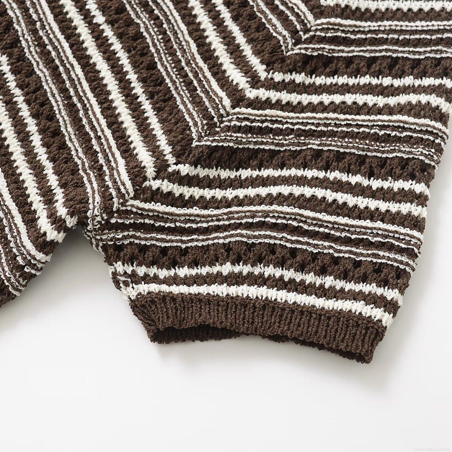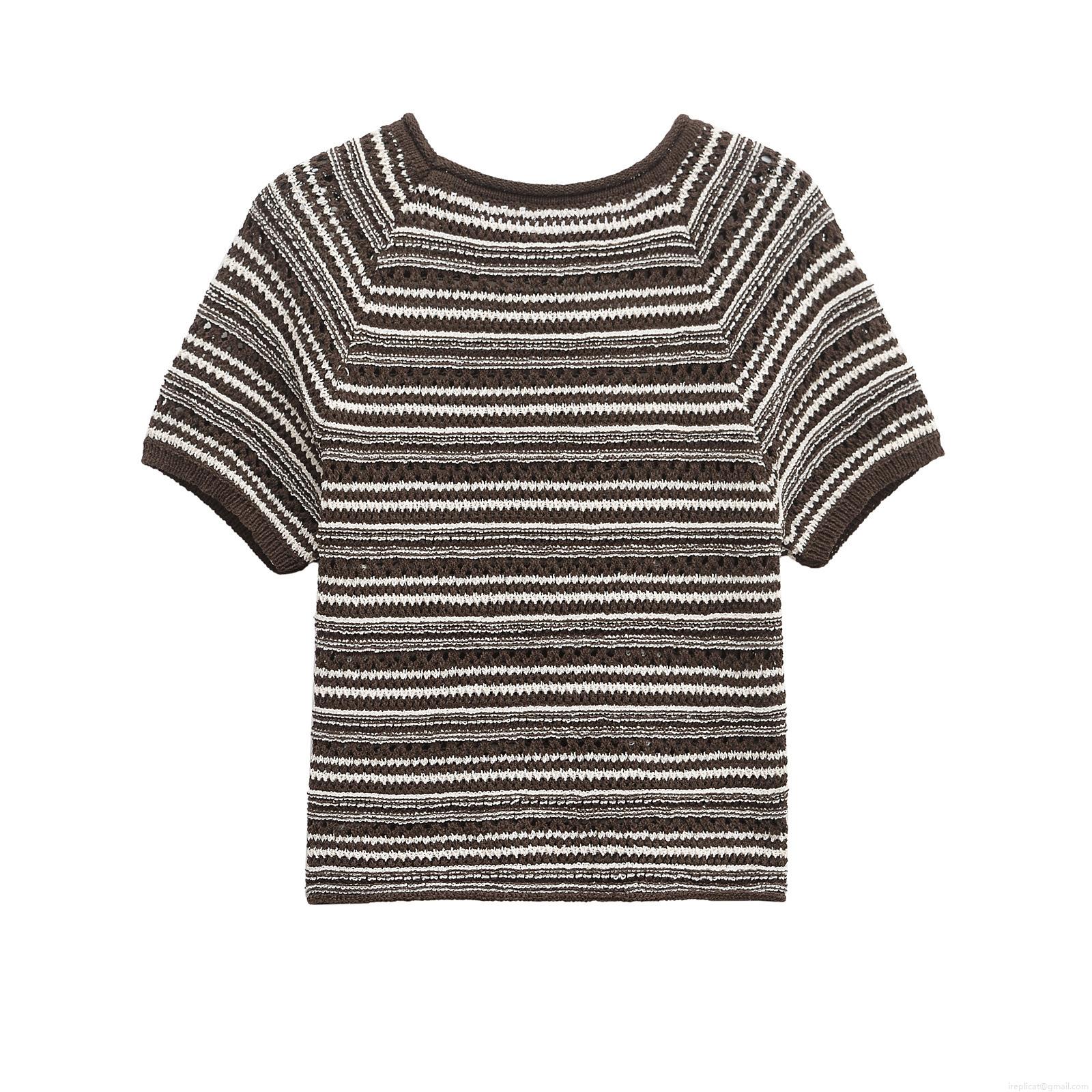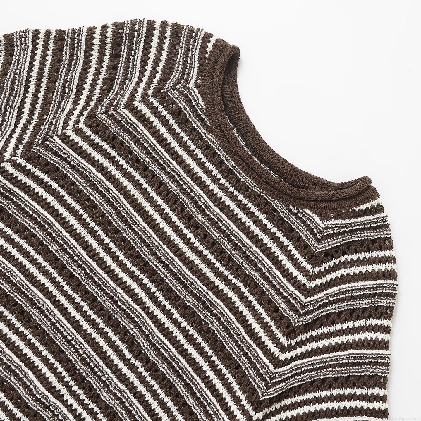 Women Striped Knit Short Sleeve Top Mercerized Cotton Crochet Hollow Out Pullover Round Neck Loose Casual Summer T-Shirt For Women Comfortable Breathable Daily Wear