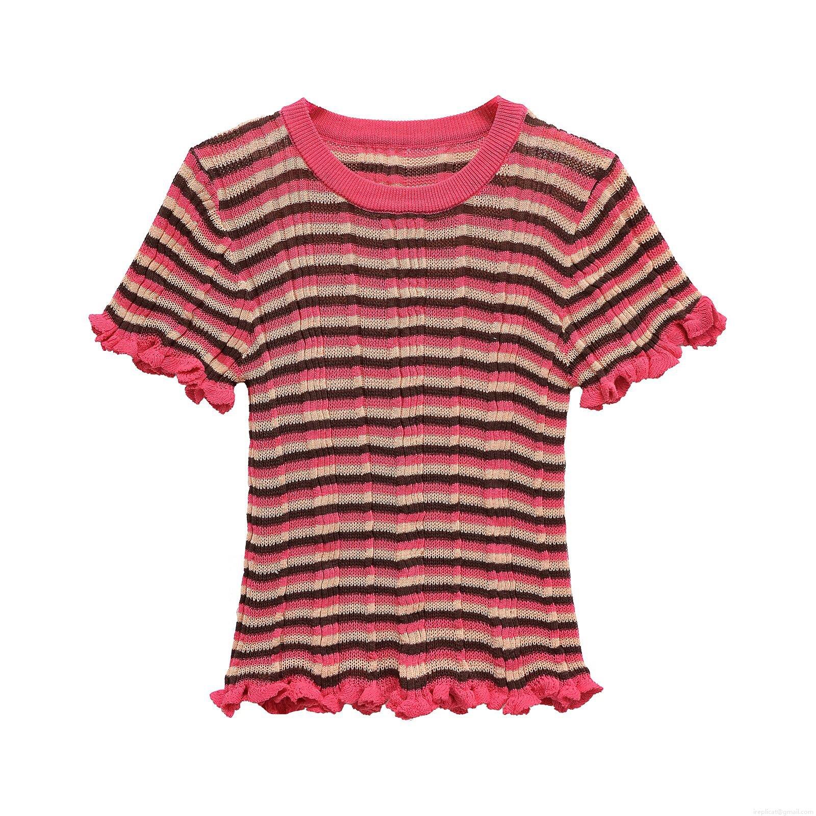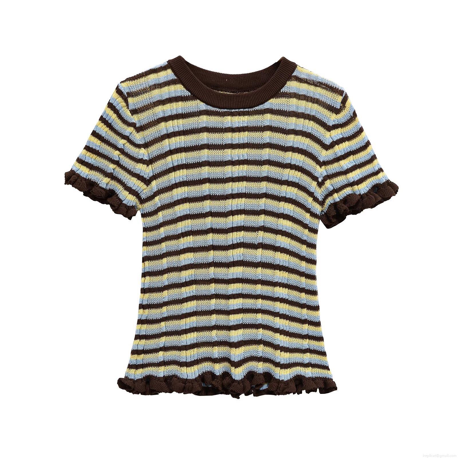 Women Striped Knit T-Shirt Mercerized Cotton Blend Short Sleeve Round Neck Wood Ear Ruffle Hem Casual Streetwear Summer Top For Women