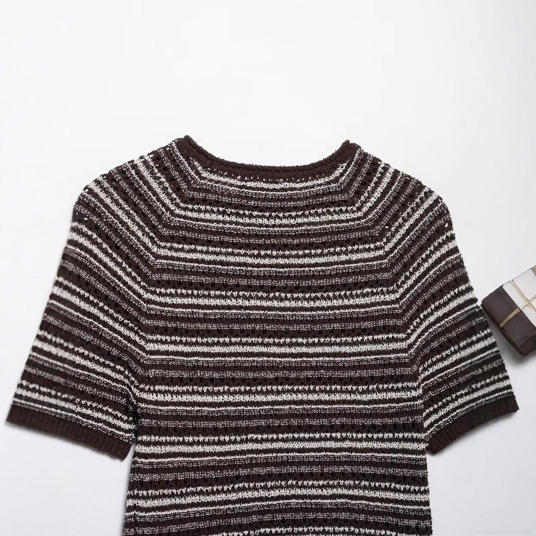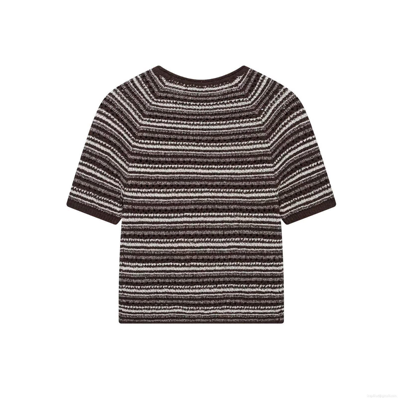 Women Striped Knit T-Shirt Polyester Open Knit Short Sleeve Round Neck Breathable Casual Streetwear Daily Vacation Retro Chic Slim Fit Crop Top