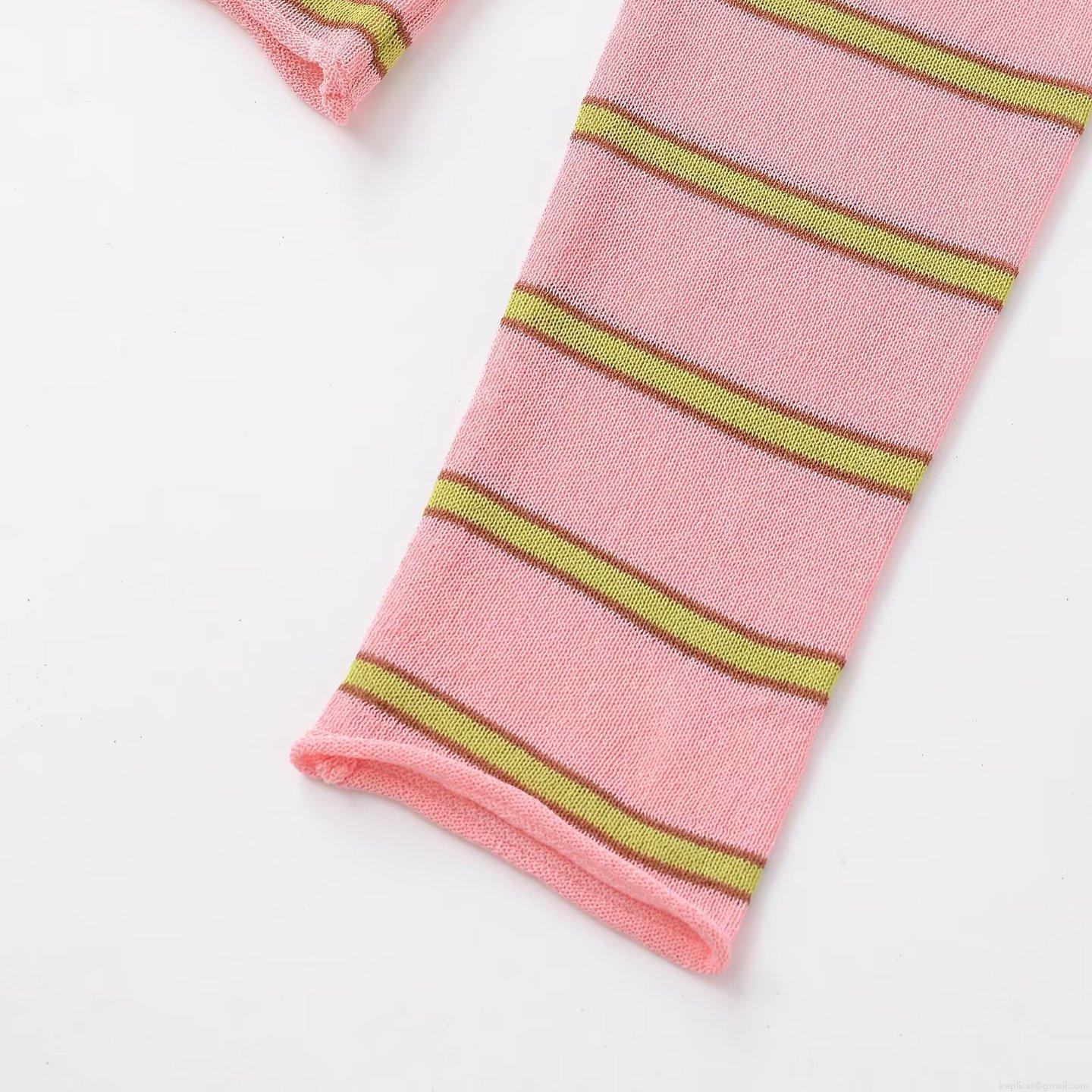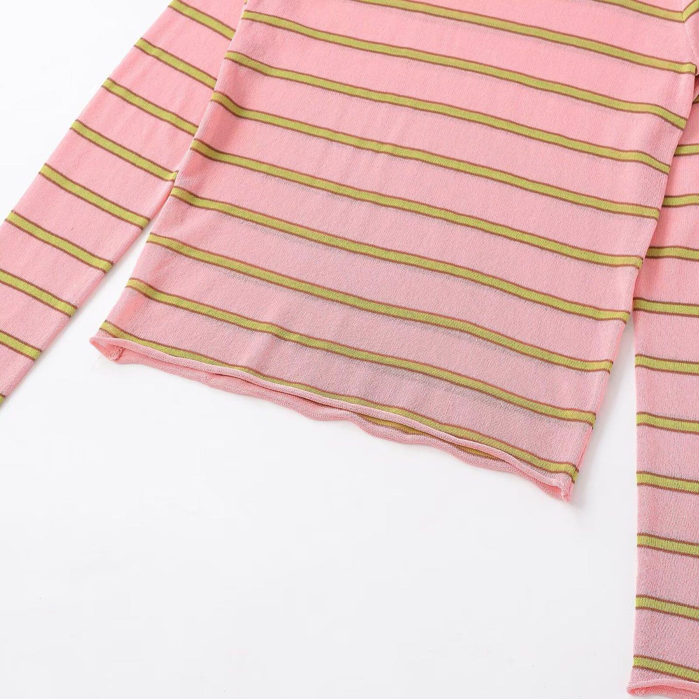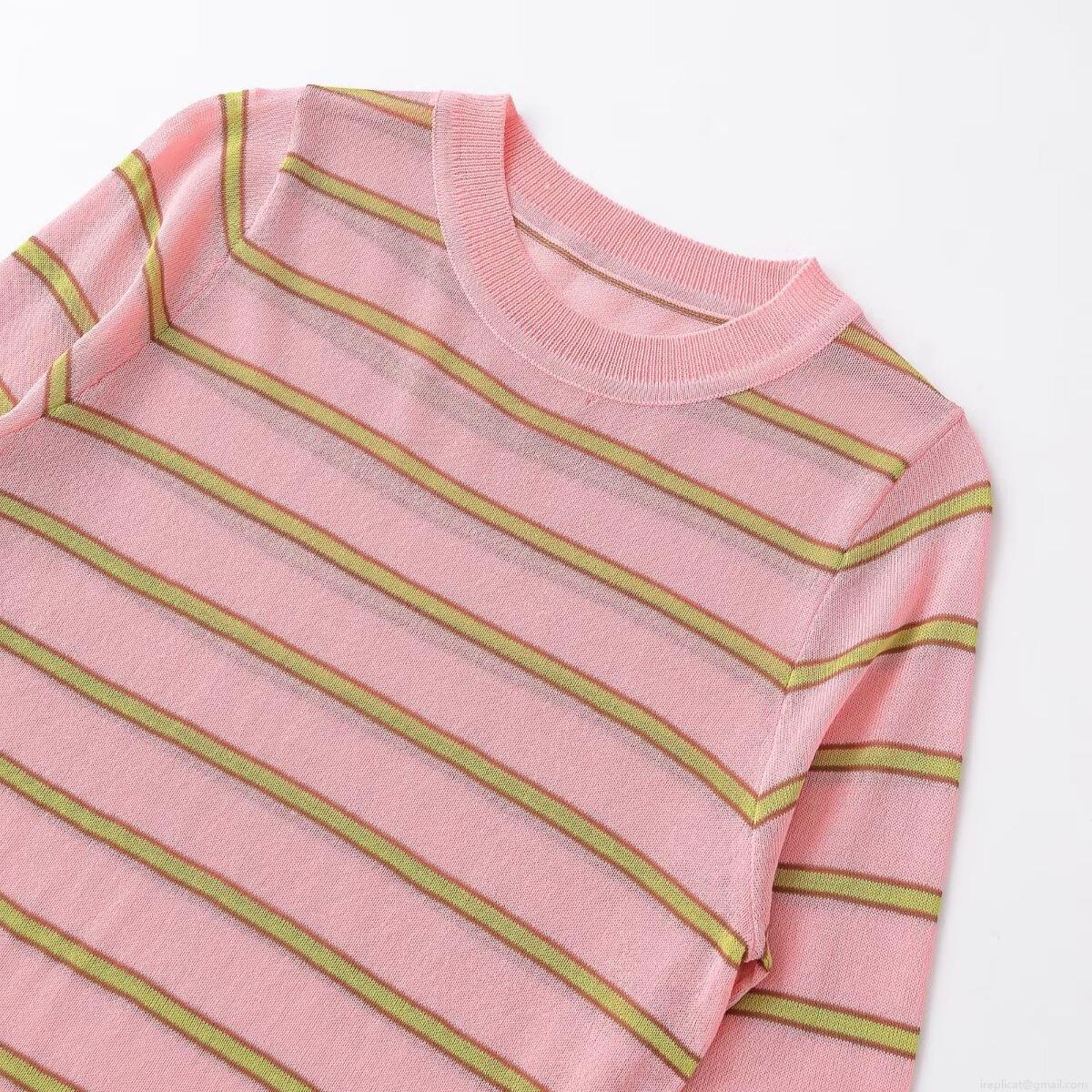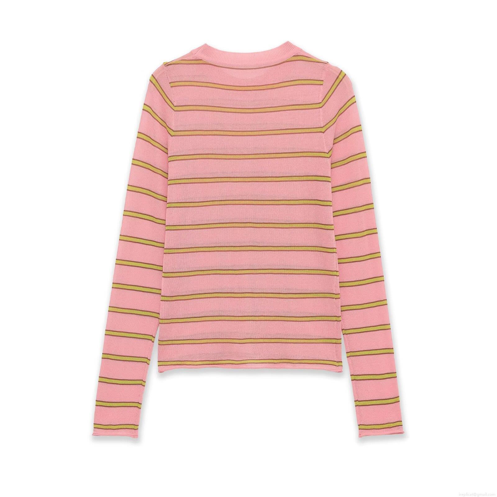 Women Striped Knit T-Shirt Polyester Round Neck Long Sleeve Slim Fit Casual Top Pink Green Yellow Stripe Spring Fashion Knitwear