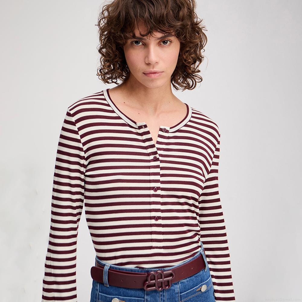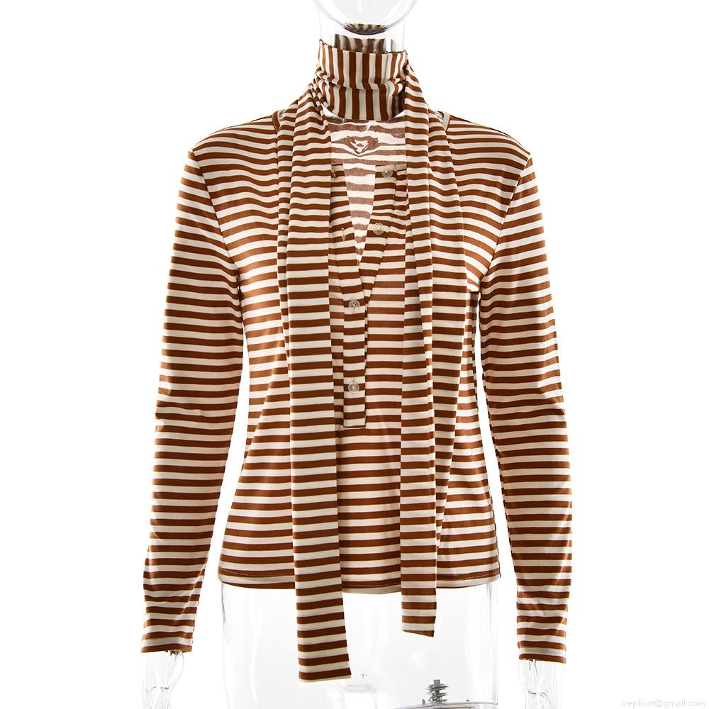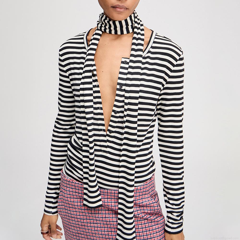 Women Striped Long Sleeve T-Shirt With Scarf Ribbed Knit Slim Fit Henley Neck Button Down Autumn Winter Polyester Cotton Blend Sexy Streetwear Top