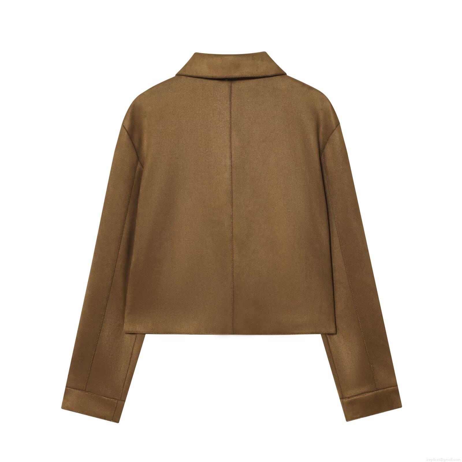 Women Suede Texture Short Jacket Long Sleeve Turnover Collar Single Breasted Baseball Coat Outerwear For Autumn Winter Streetwear Ladies Dark Brown Top
