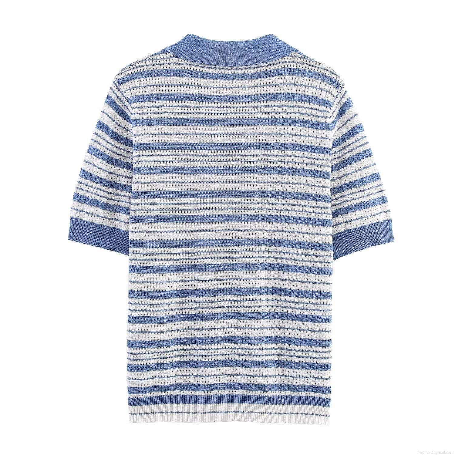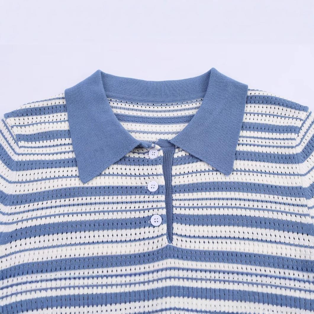 Women Summer Casual Knit Polo Shirt Blue White Striped Pointelle Hollow Out Short Sleeve Button Down Tops For Vacation Daily Wear