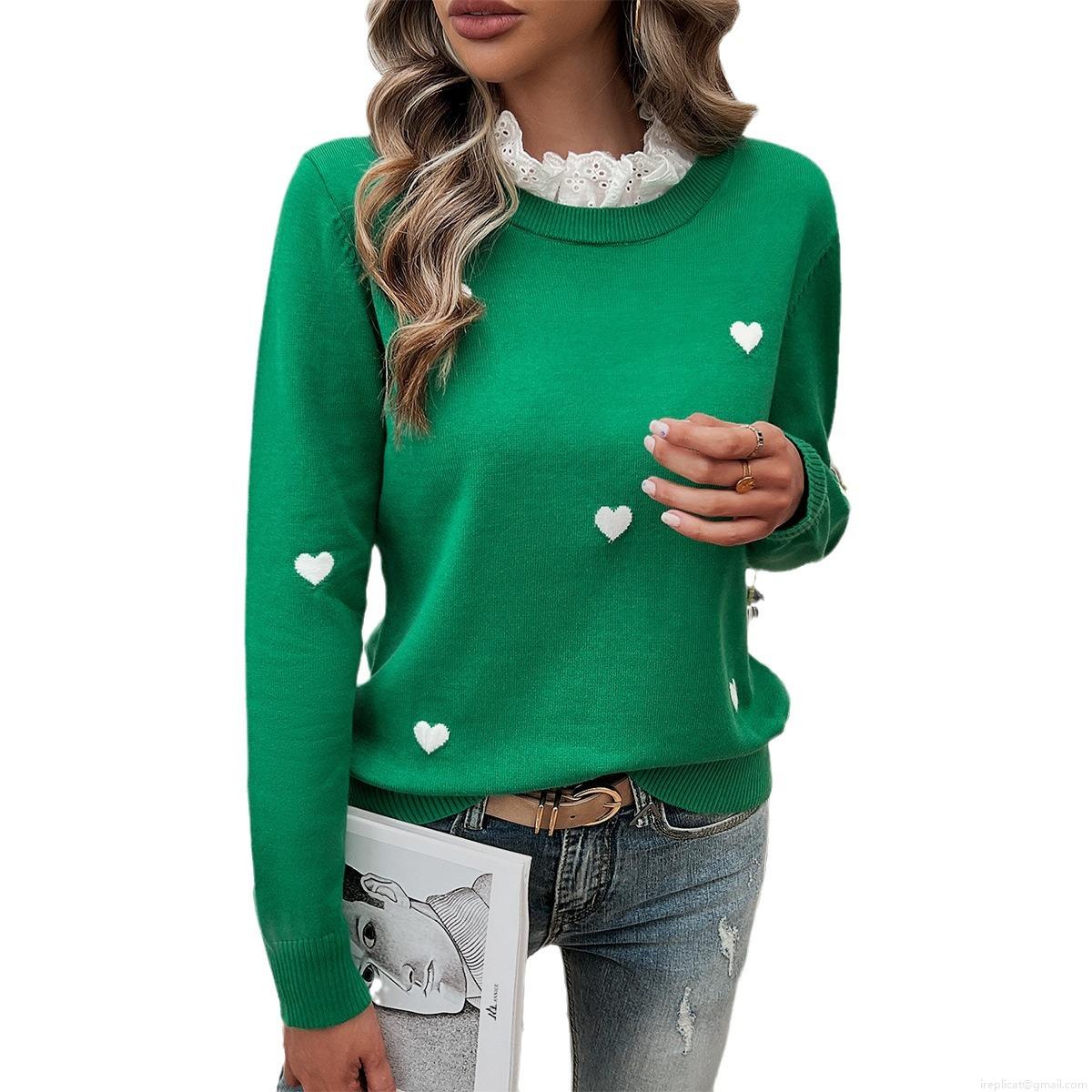 Women Sweet Heart Embroidery Knit Sweater Viscose Polyester Blend Lace Trim Collar Pullover Long Sleeve Casual Jumper Tops For Autumn Winter
