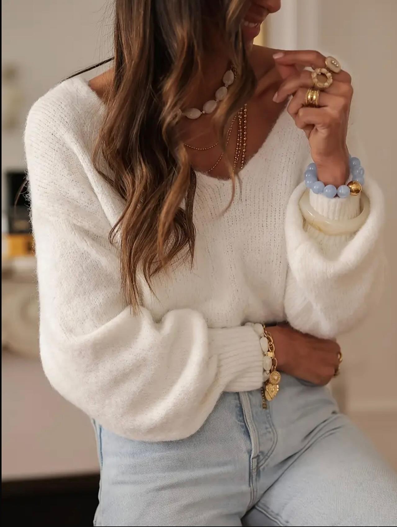 Women V Neck Knitted Sweater With Large Striped Bow Backless Loose Pullover Long Lantern Sleeve Soft Casual Elegant Jumper Tops For Women
