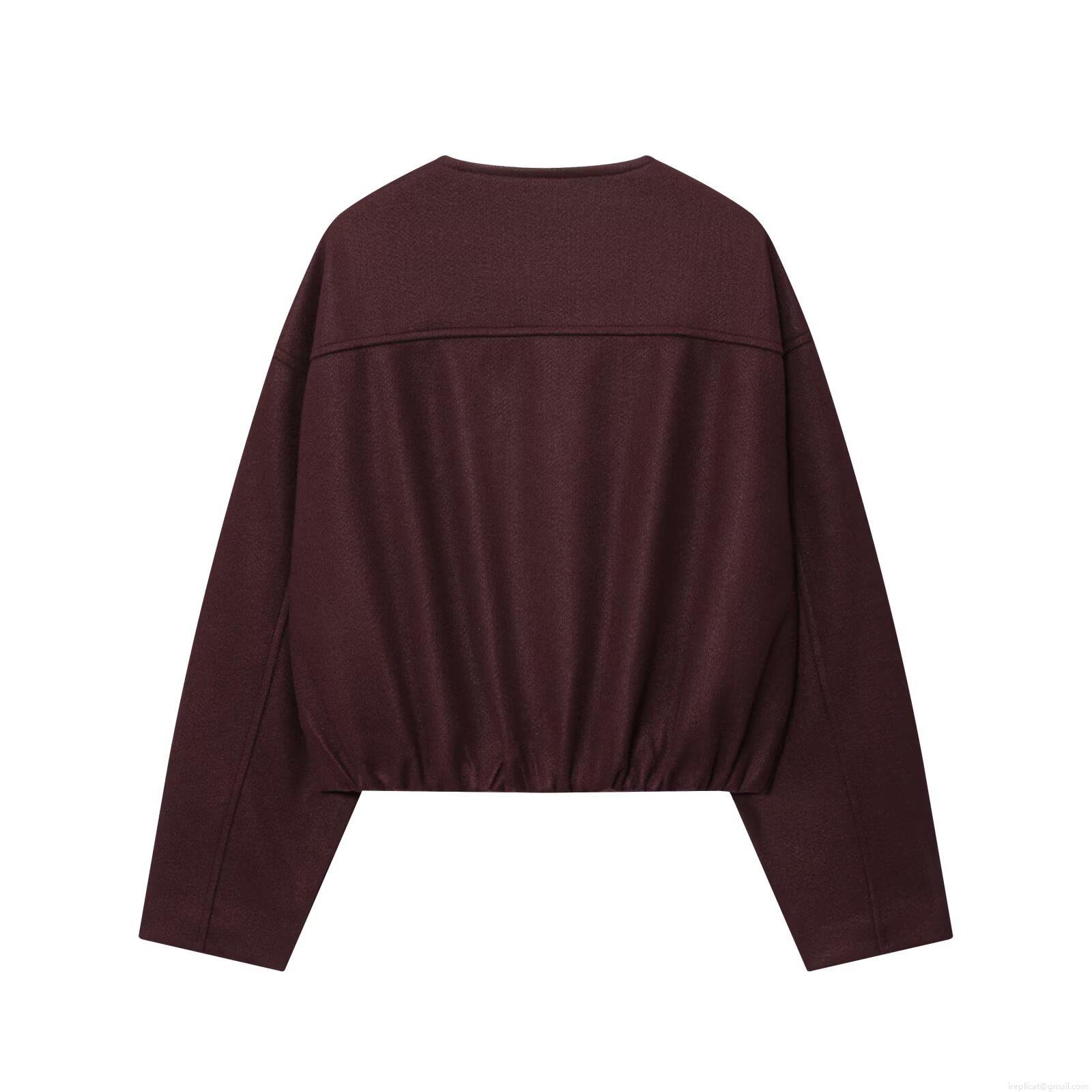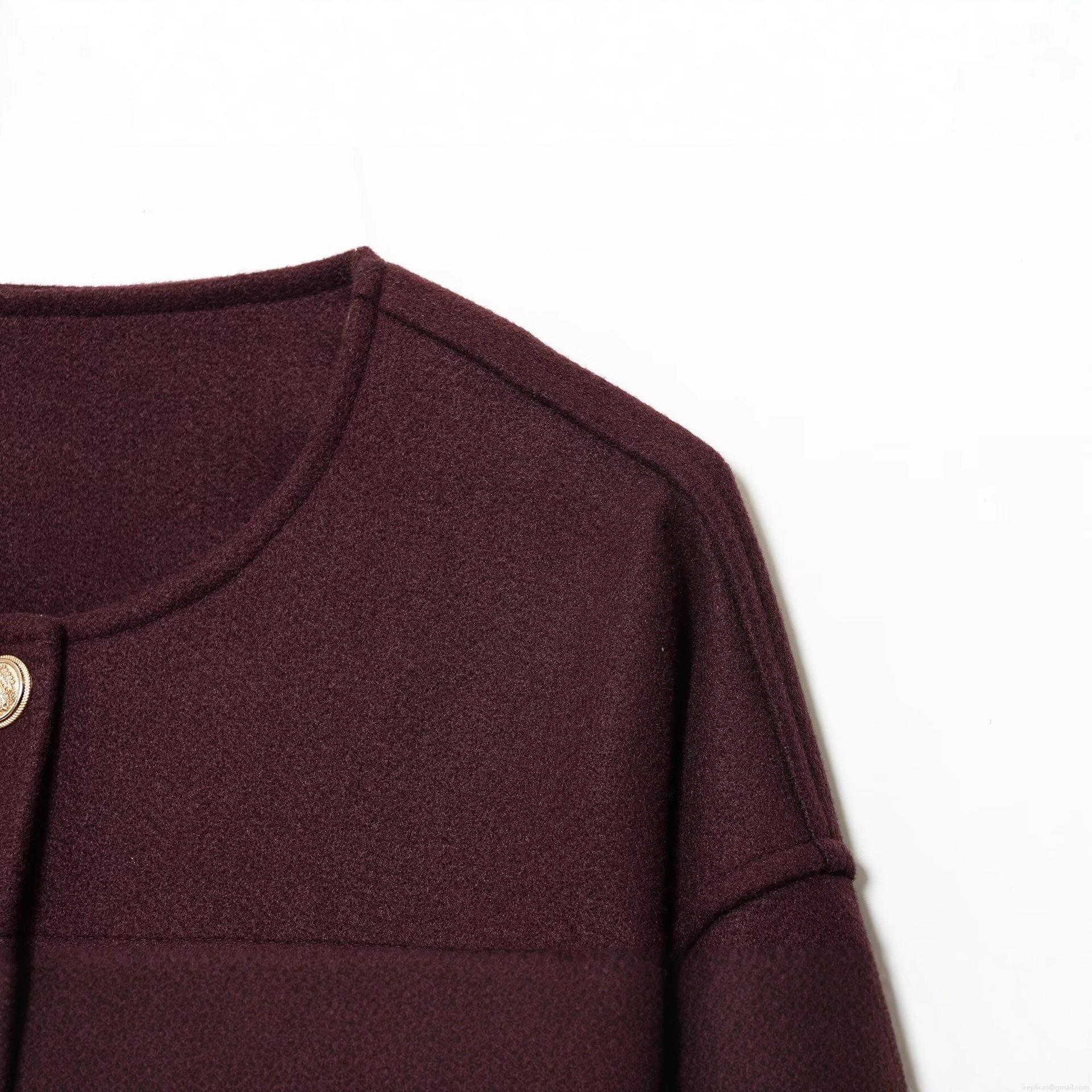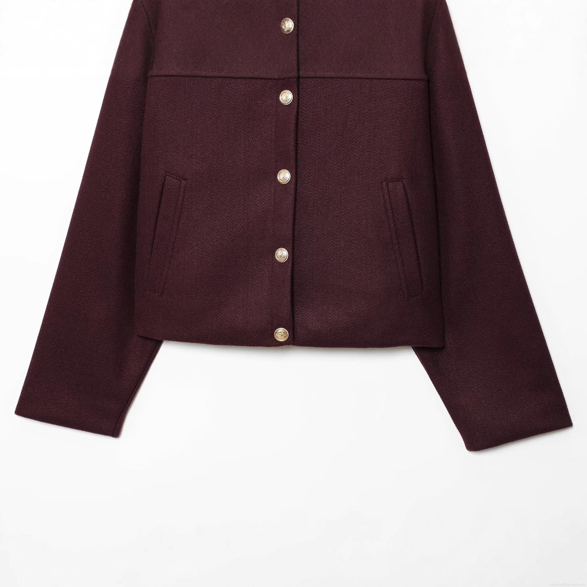 Women Vintage Burgundy Woolen Texture Jacket Gold Button Round Neck Loose Short Coat Autumn Streetwear Fashion Baseball Uniform Long Sleeve Outwear