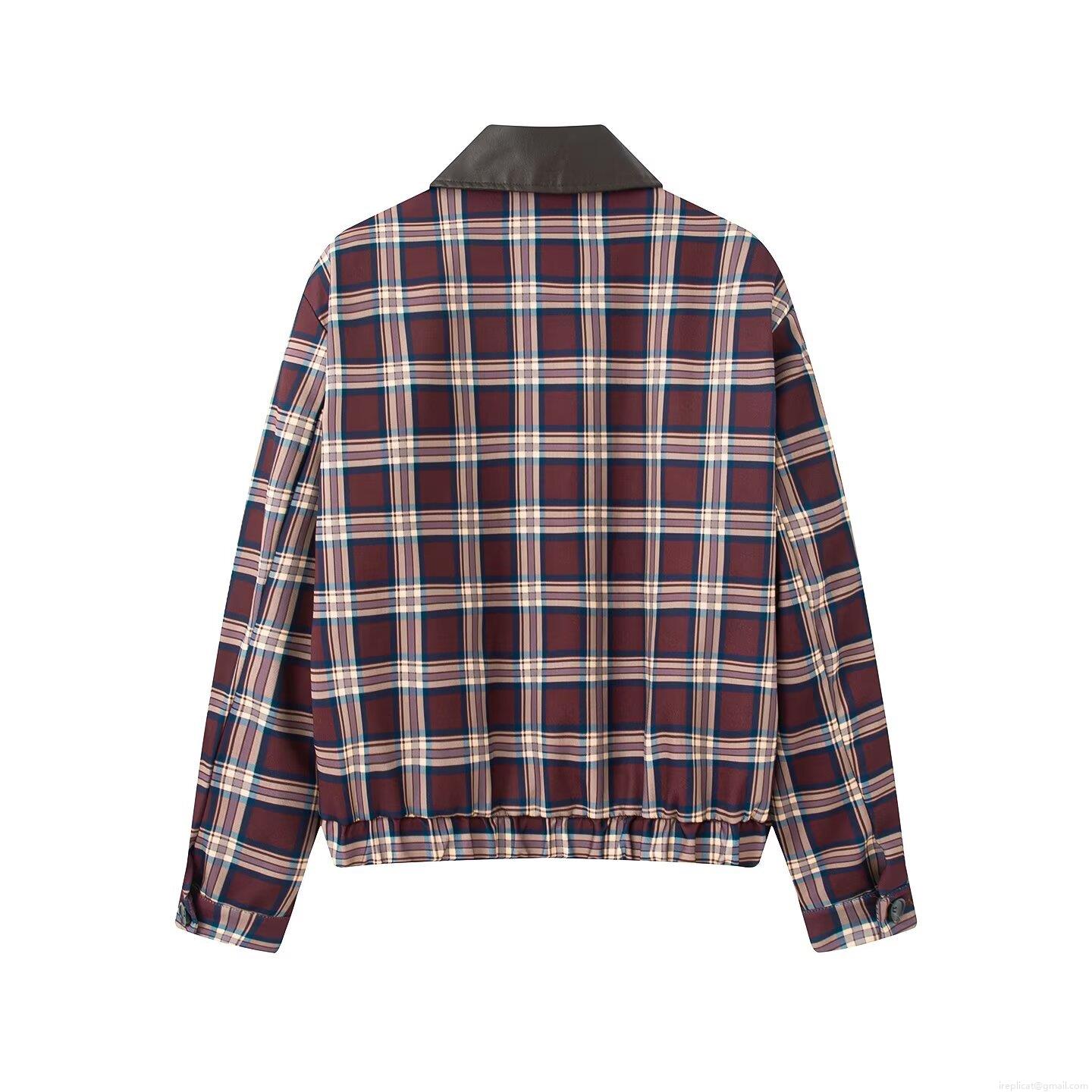 Women Vintage Plaid Jacket With Faux Leather Lapel Collar Casual Loose Long Sleeve Full Zip Bomber Coat Streetwear Burgundy Checked Outwear