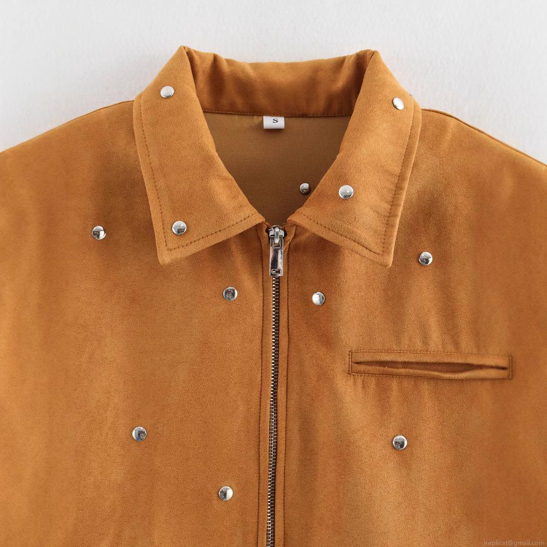 Women Vintage Suede Jacket With Metal Rivets Decoration Long Sleeve Cropped Outerwear Western Street Style Zipper Coat For Spring Autumn Fashion