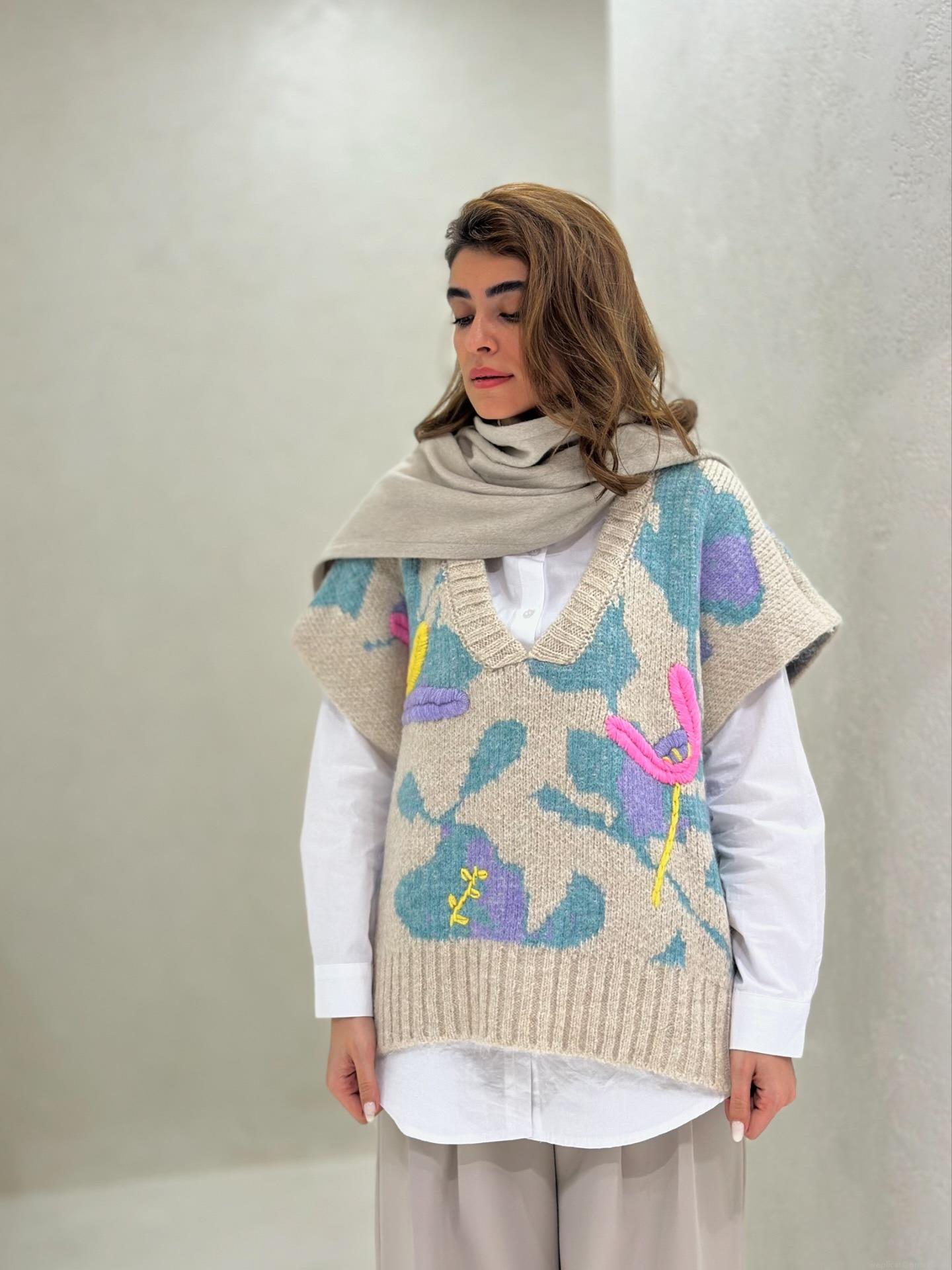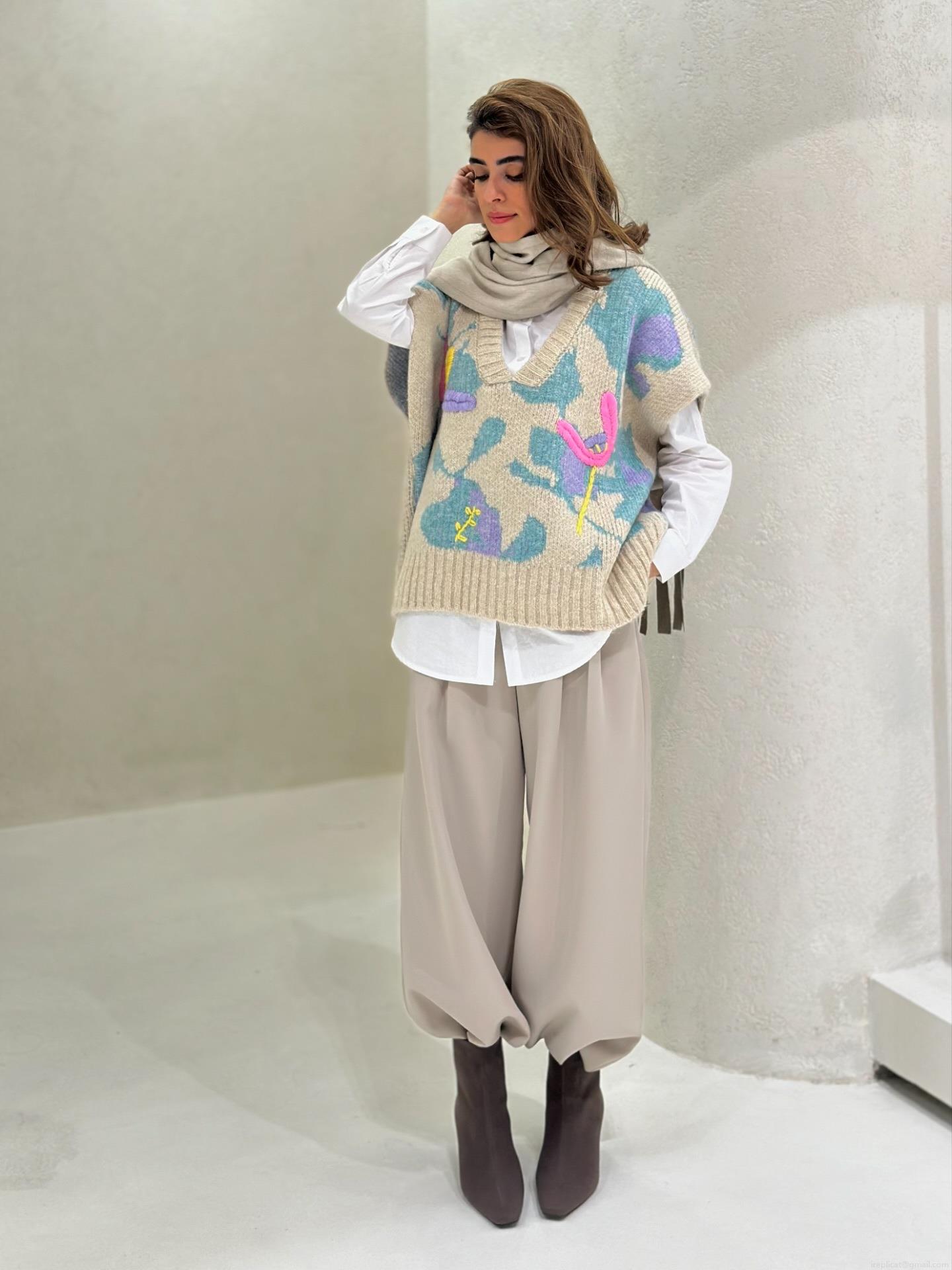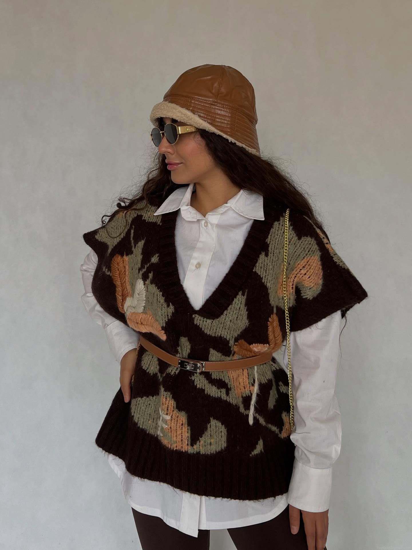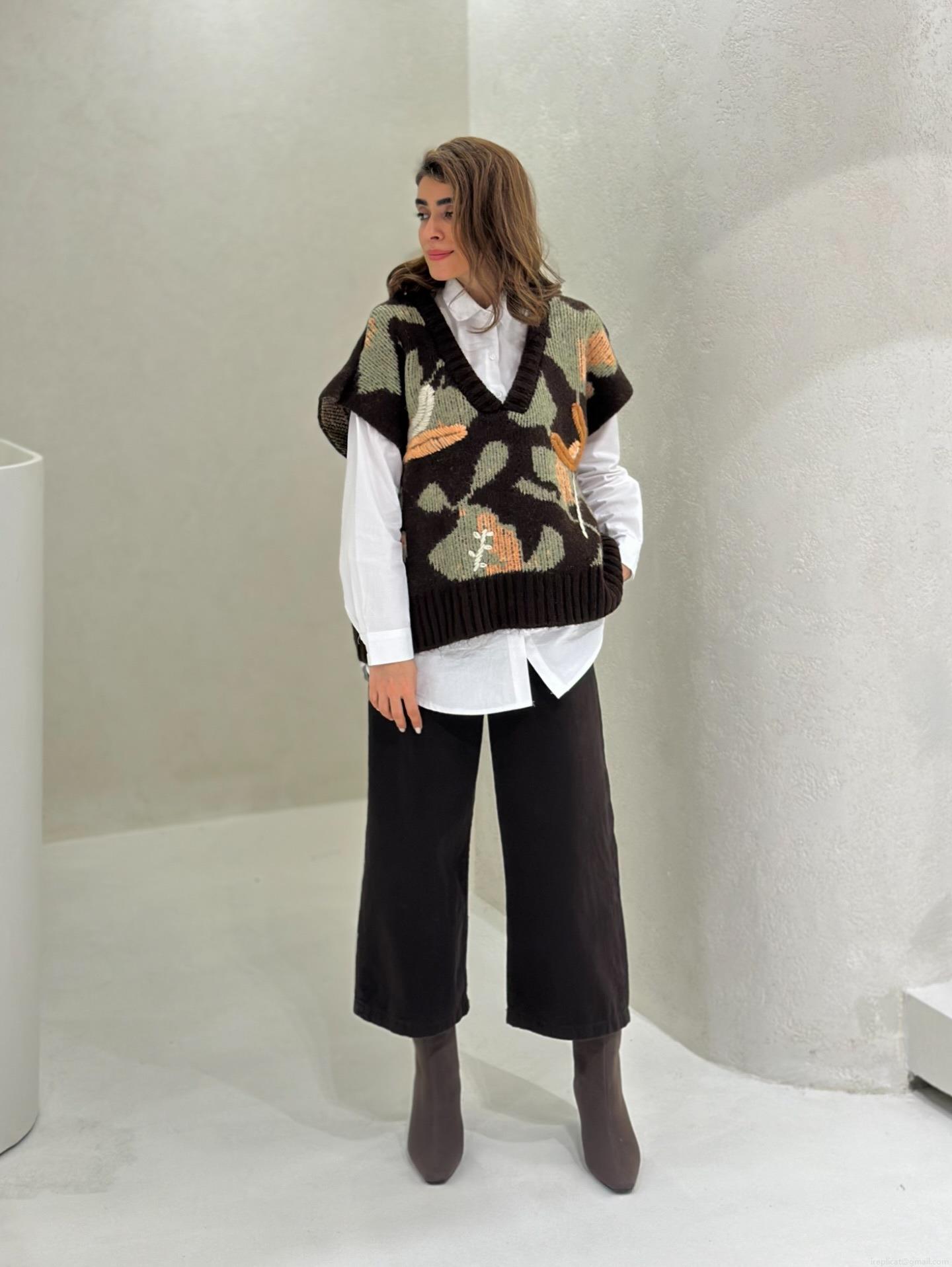 Women V-Neck Knit Sweater Vest 80% Cotton Blend Abstract Floral Print Sleeveless Pullover Retro Old Money Style Casual Top For Spring Autumn Streetwear