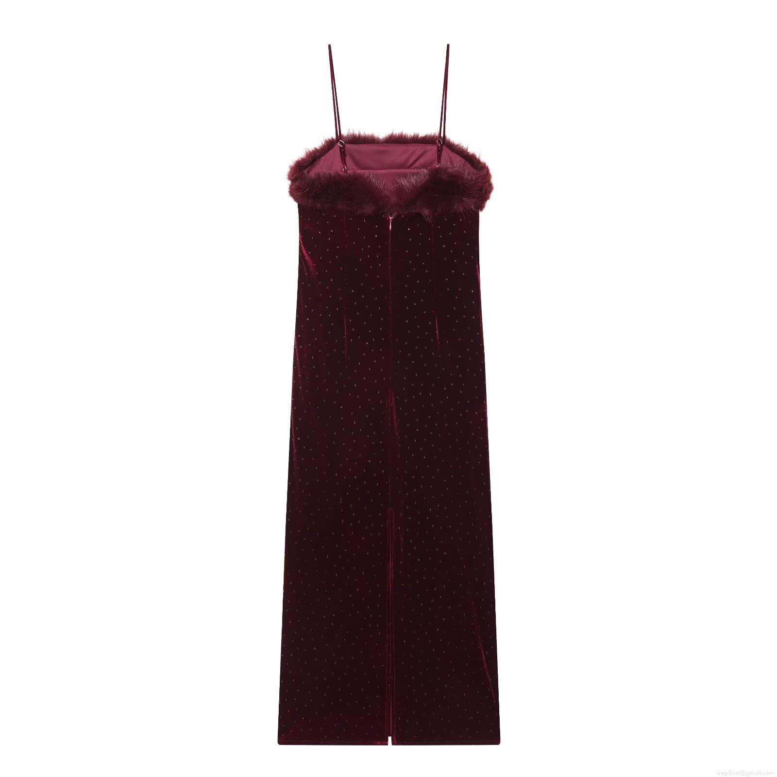 Invisible Zipper On The Back, Ultra-thin Straps, Fur Trim, Hot-fix Rhinestone Fabric