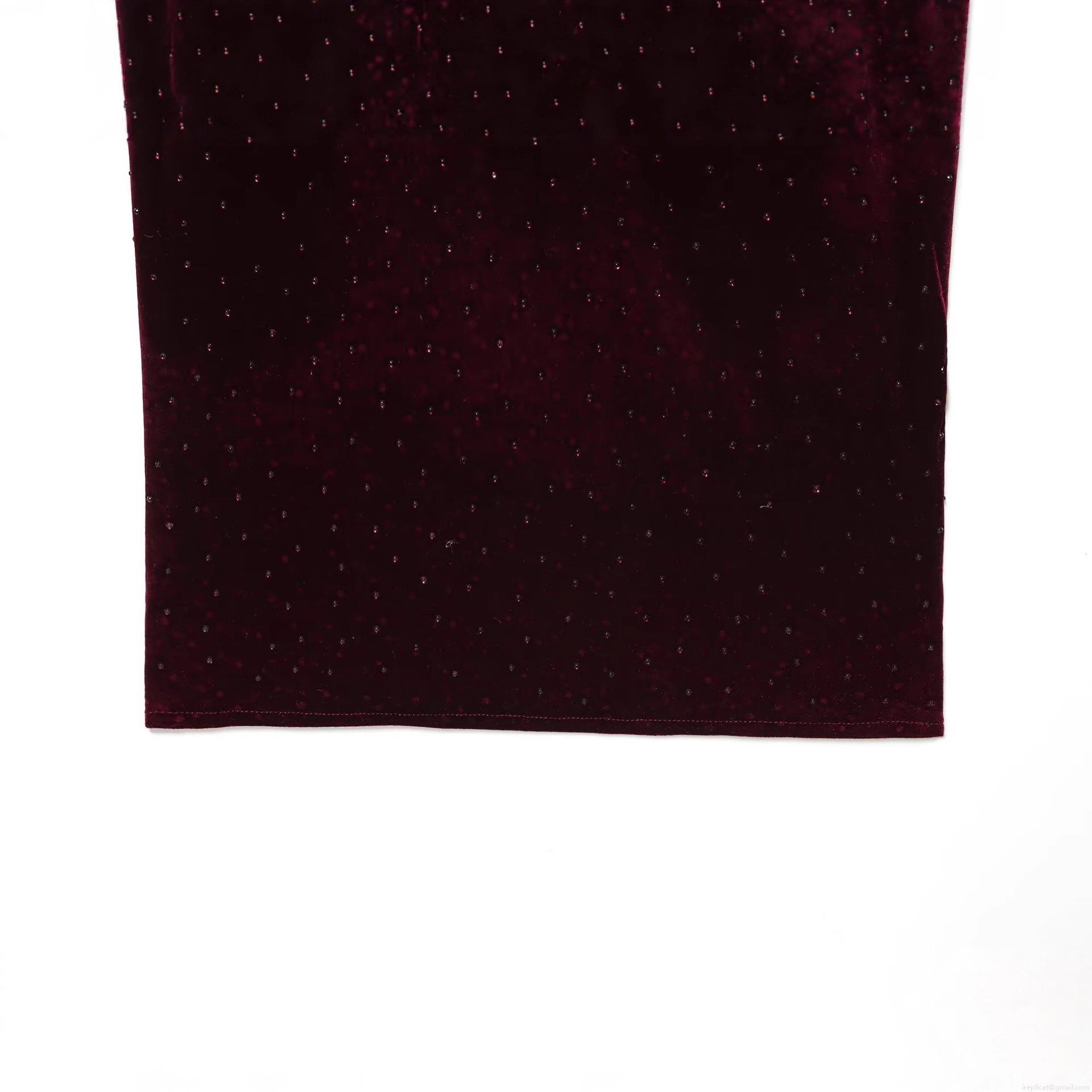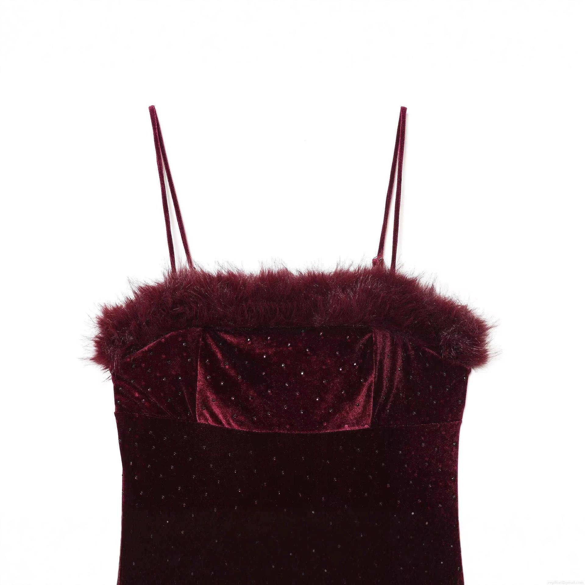 Women Wine Red Velvet Cami Maxi Dress With Faux Fur Trim Rhinestone Decoration Luxury Spaghetti Strap Party Evening Gown Elegant Slim Fit Banquet Wedding Clothing