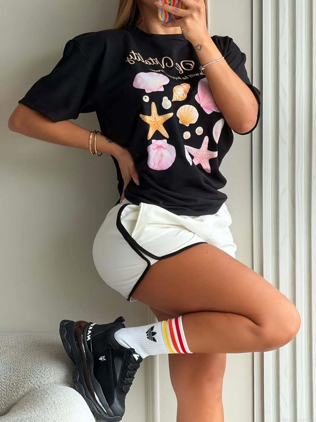 Women's 95% Cotton Marine Print Short Sleeve T-Shirt Sweet Cool Starfish Shell Pattern Oversized Pullover Top Streetwear Tee