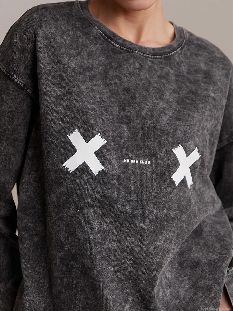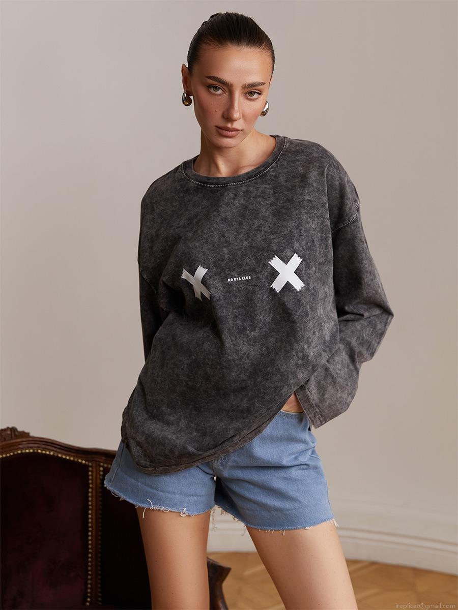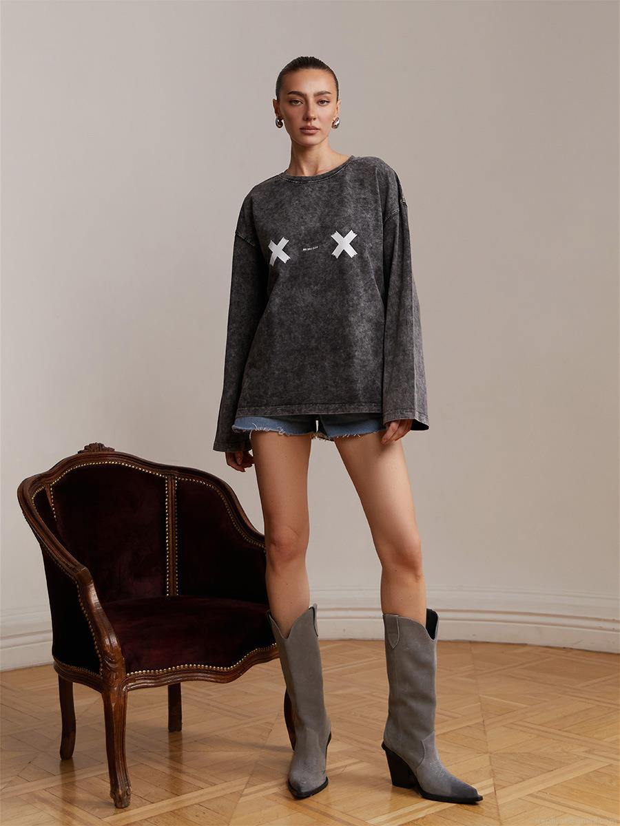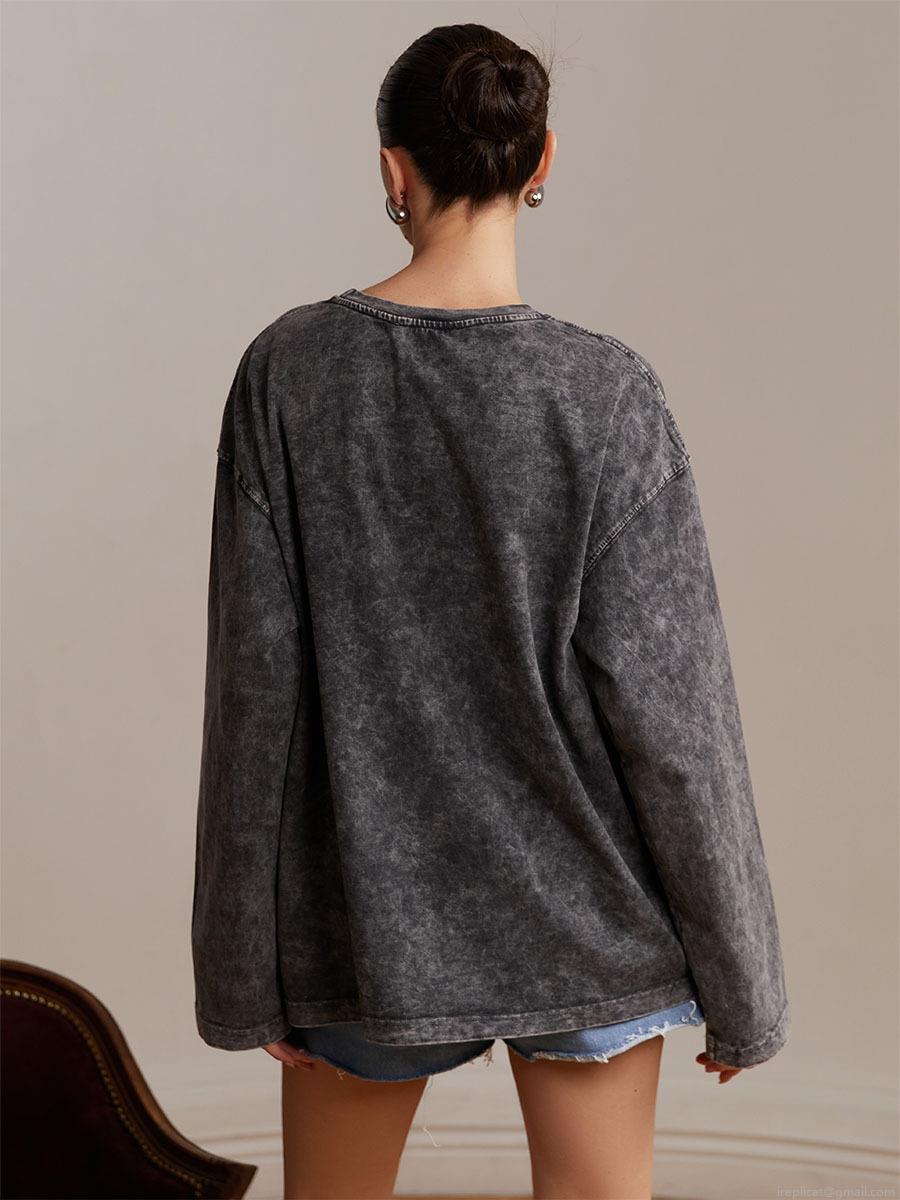 Women's Acid Wash Long Sleeve T-Shirt Cotton Distressed Graphic Print Top Vintage American Streetwear Oversized Round Neck Pullover Tee