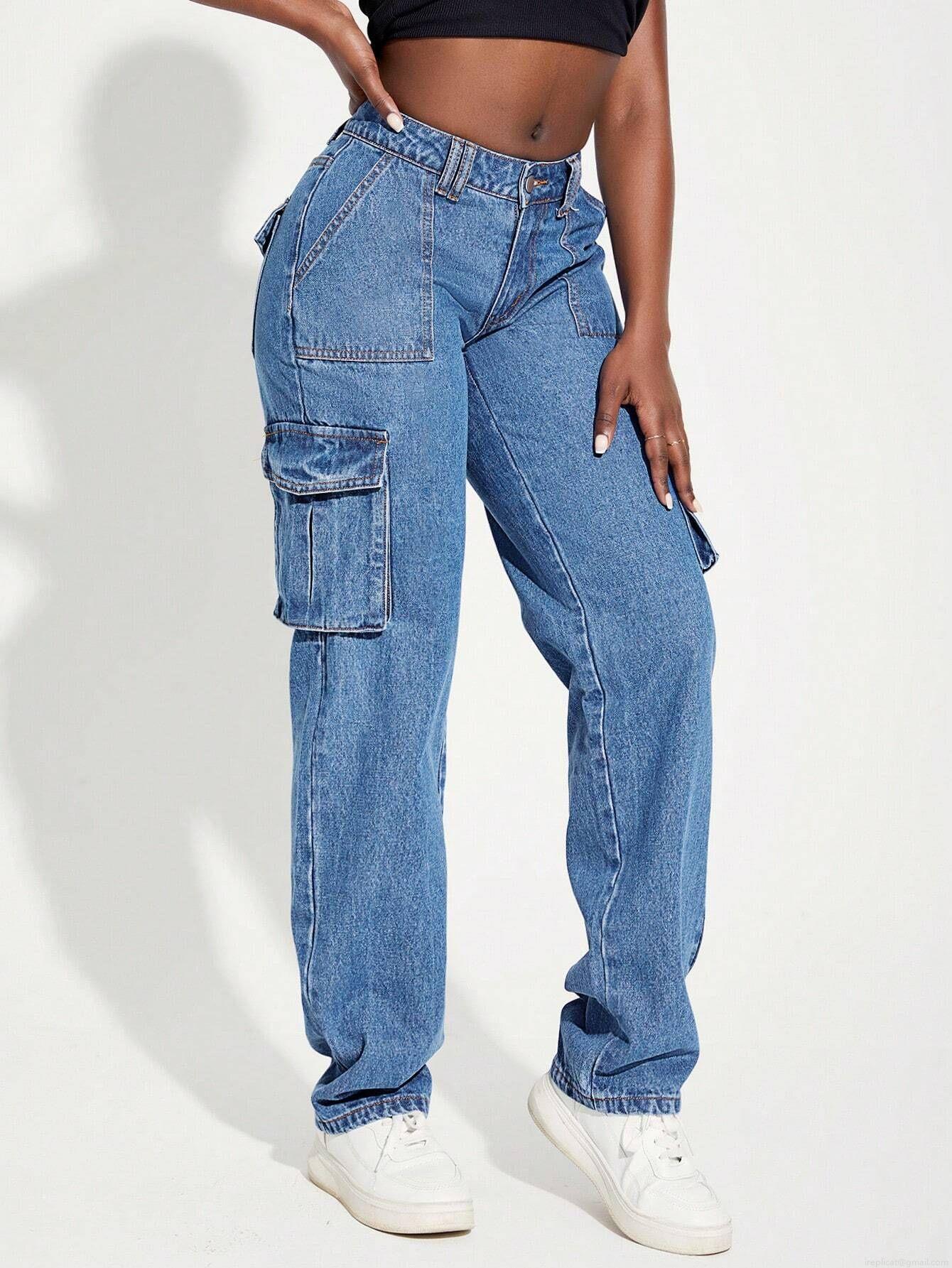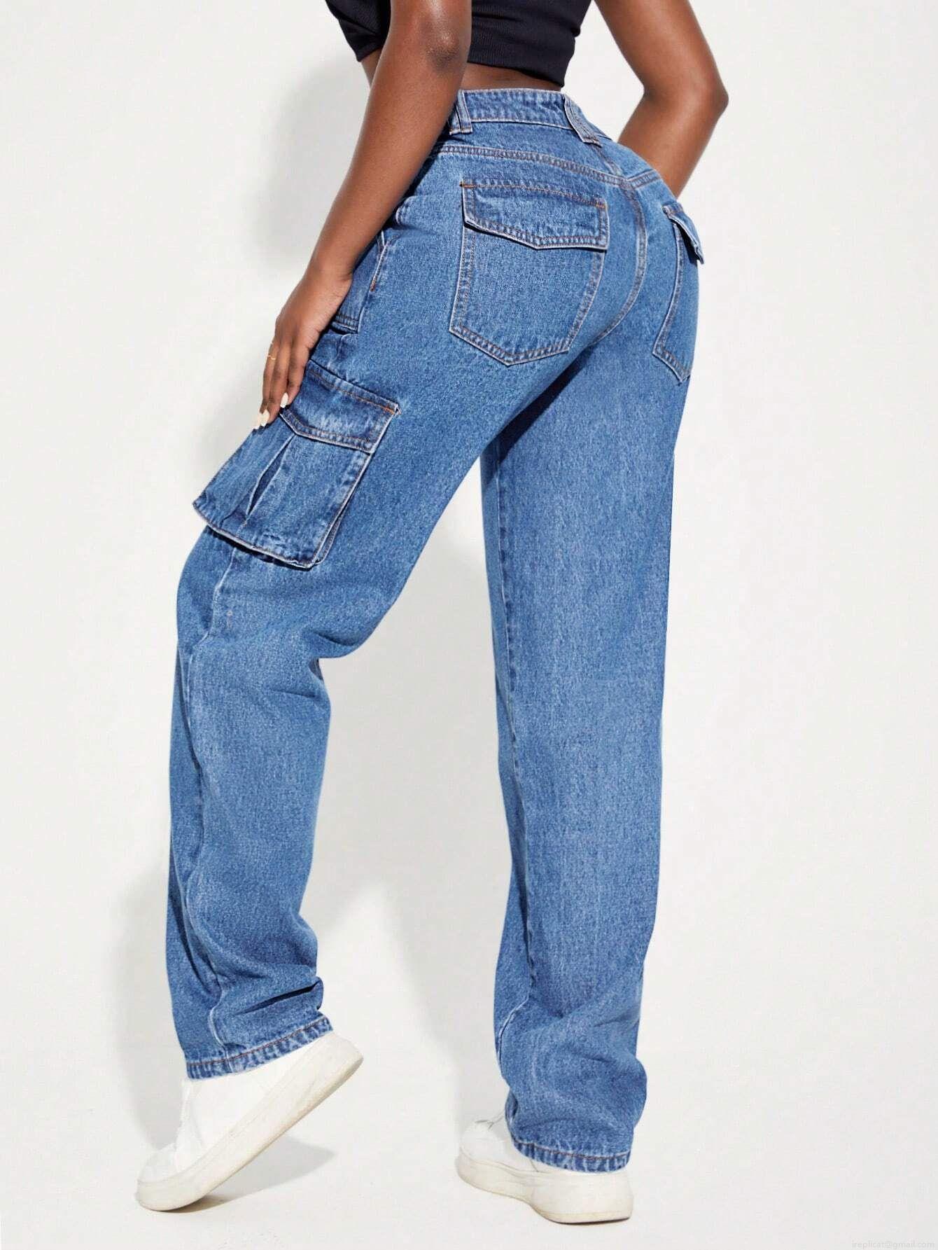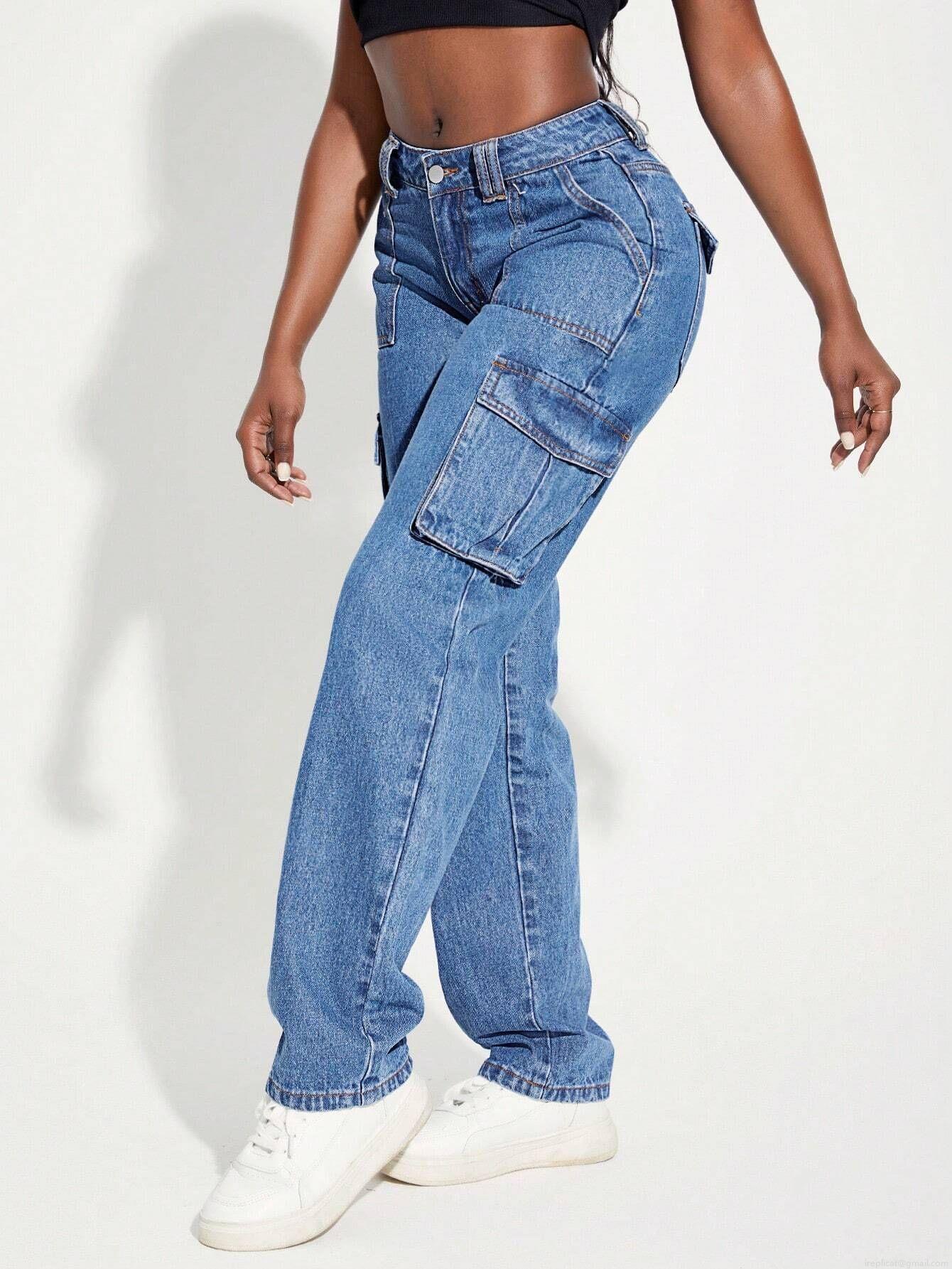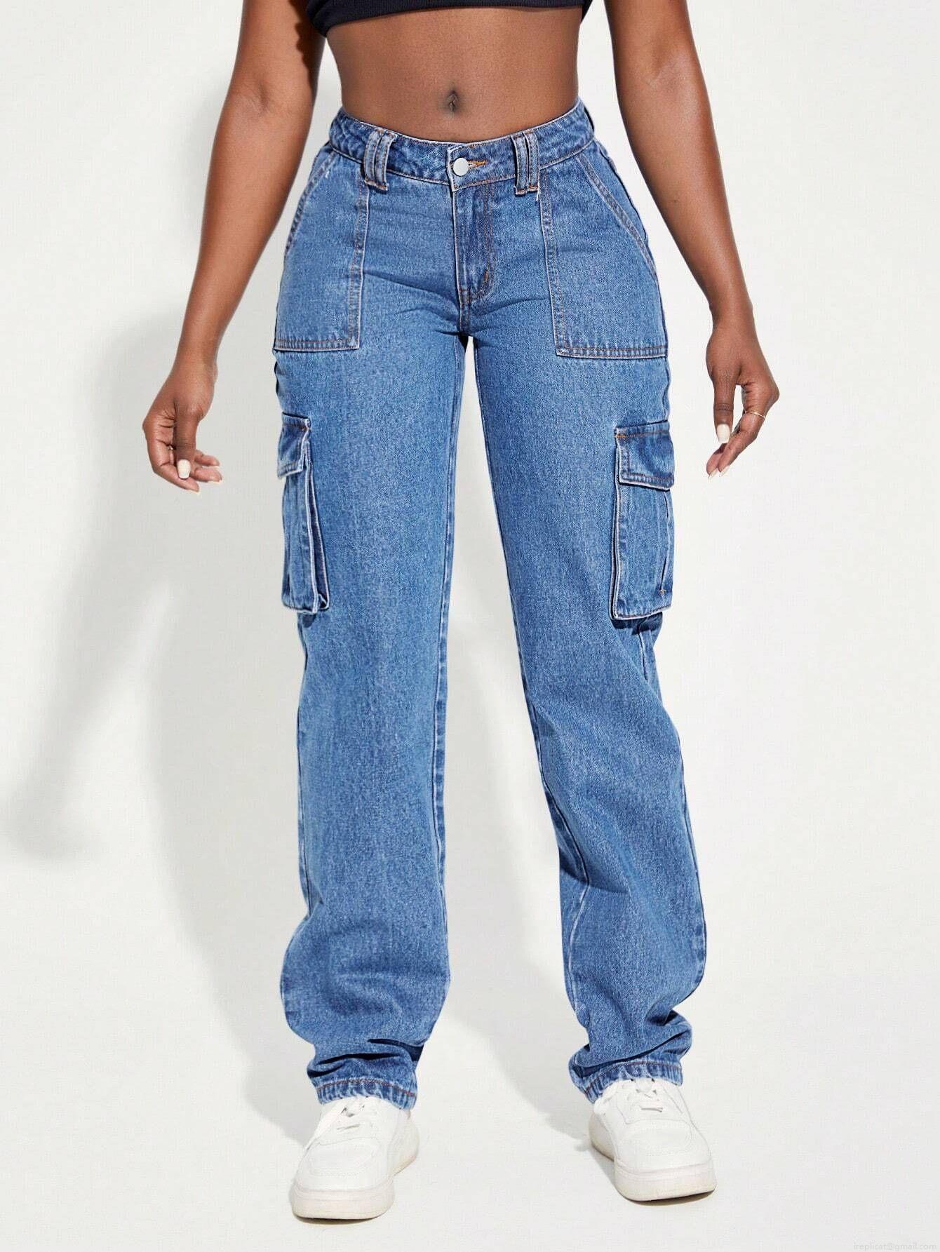 Women's American Retro High Waist Cargo Jeans Multi-pocket Straight Leg Denim Pants Streetwear Washed Blue Baggy Cotton Blend Trouser