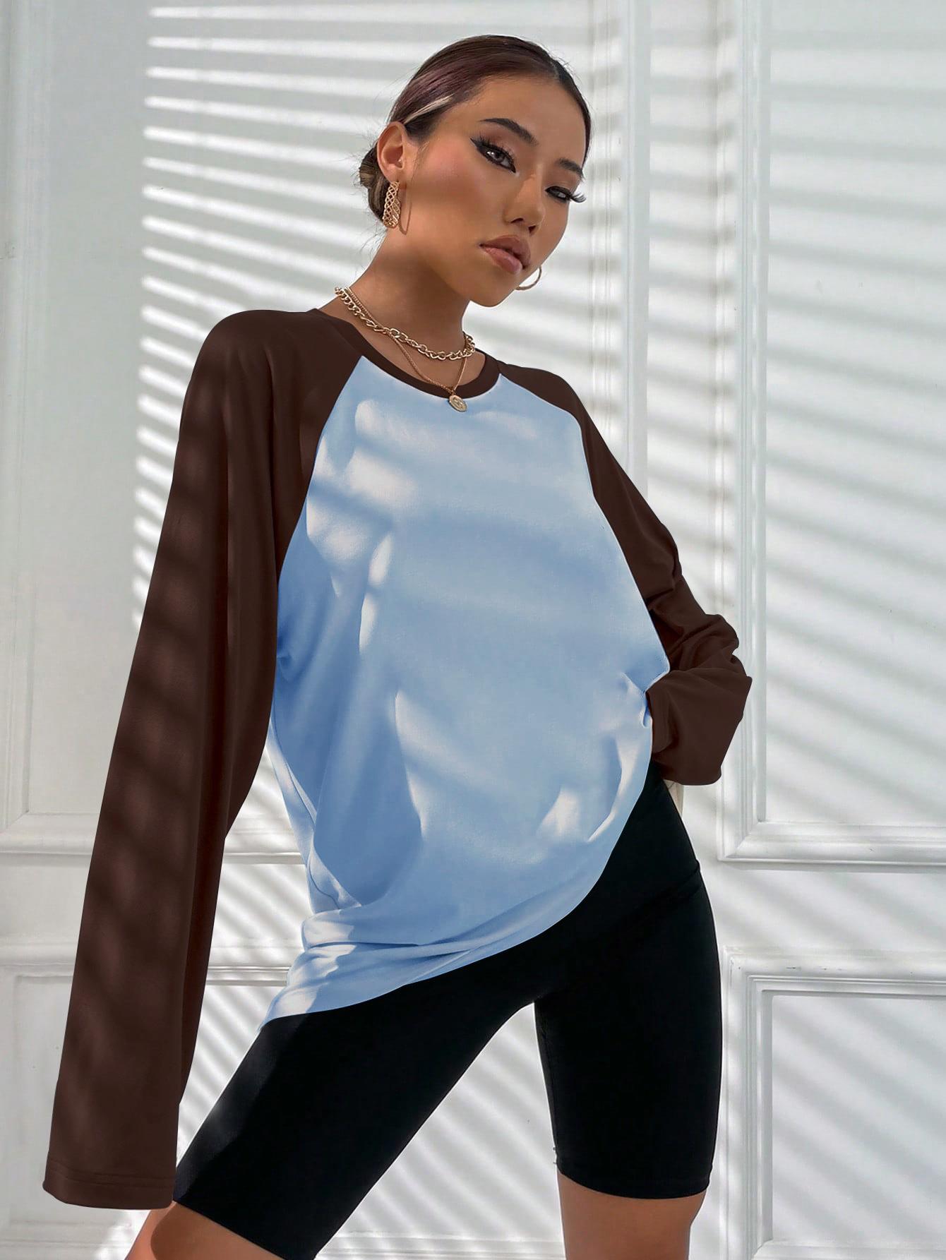 Women's American Retro Raglan Sleeve T-Shirt Loose Fit Color Block Long Sleeve Top Cotton Blend Patchwork Round Neck Casual Streetwear Pullover for Women
