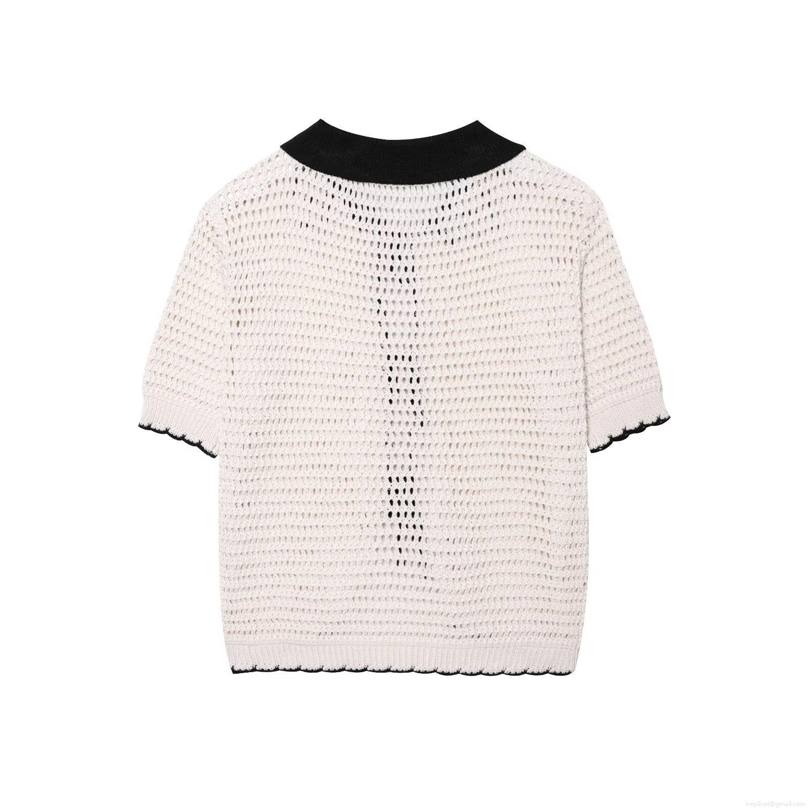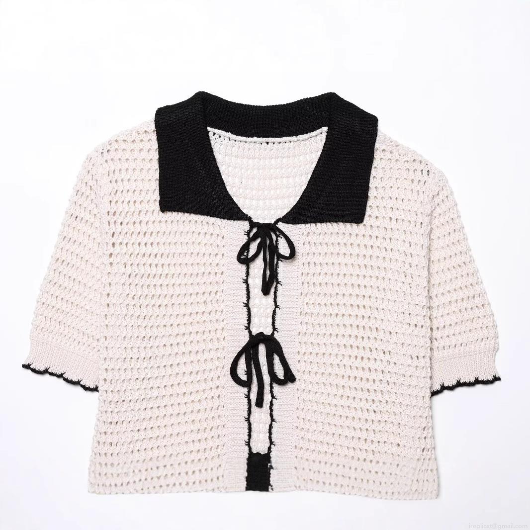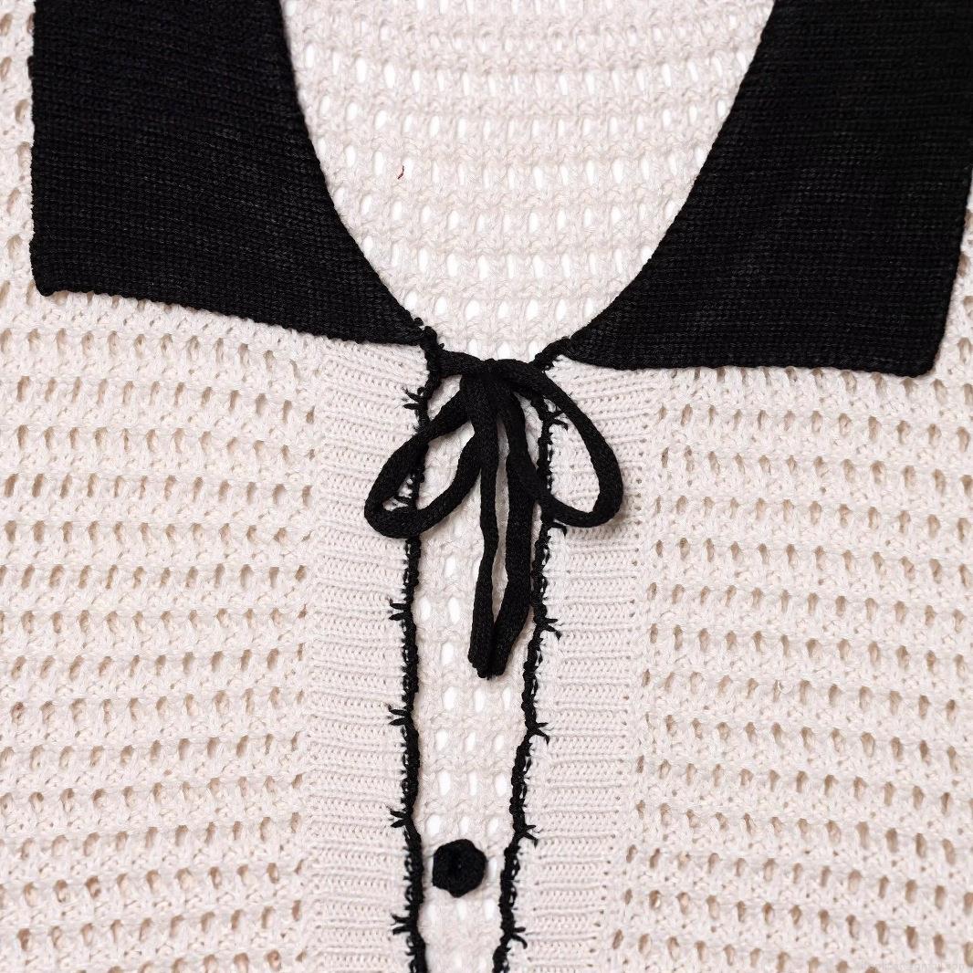 Women's American Retro Sexy Hot Girl Style Crochet Polo Shirt Hollow Out Knit Top With Bow Tie Color Block Short Sleeve Breathable Summer Streetwear Cardigan For Women