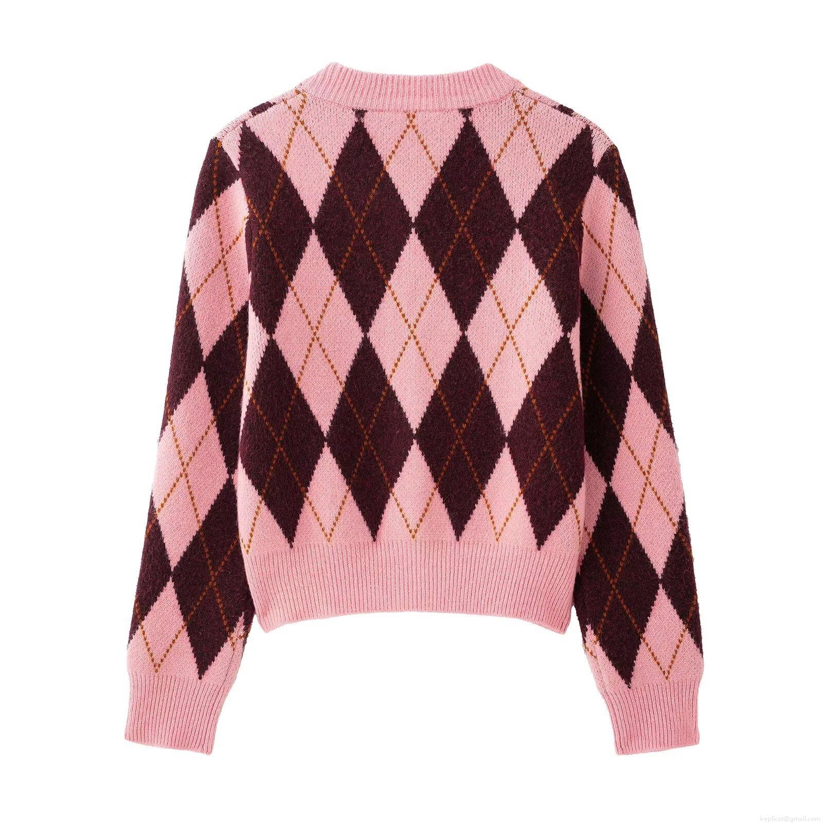 Women's Argyle Plaid Knit Cardigan Sweater Round Neck Long Sleeve Single Breasted Knitted Jacket Outerwear Pink Streetwear Vintage Fashion Top