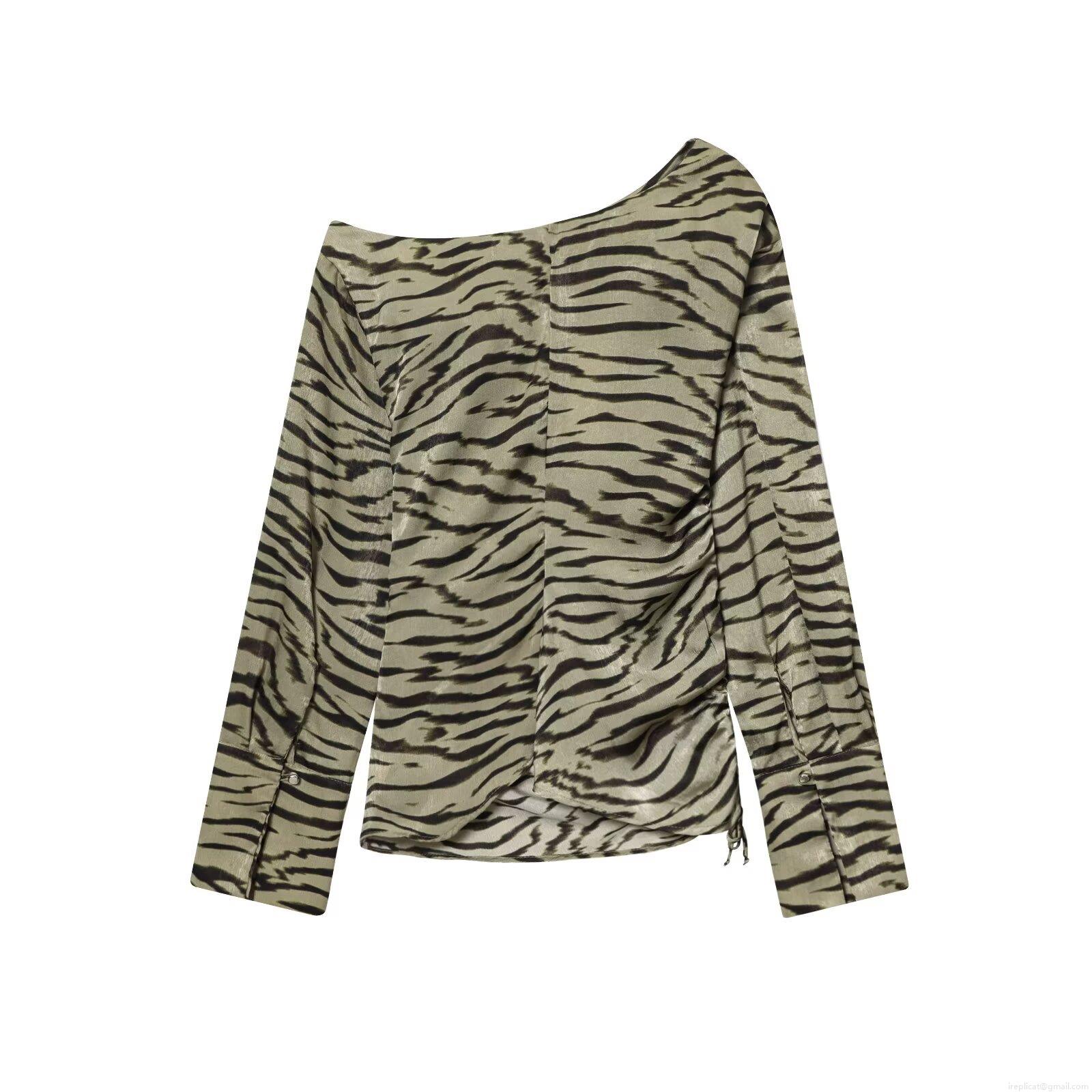 Women's Asymmetric Animal Print Polyester Top Sexy One Shoulder Side Drawstring Ruched Long Sleeve T-Shirt With Metal Button Zebra Tiger Stripe Satin Luster Blouse For Party Streetwear
