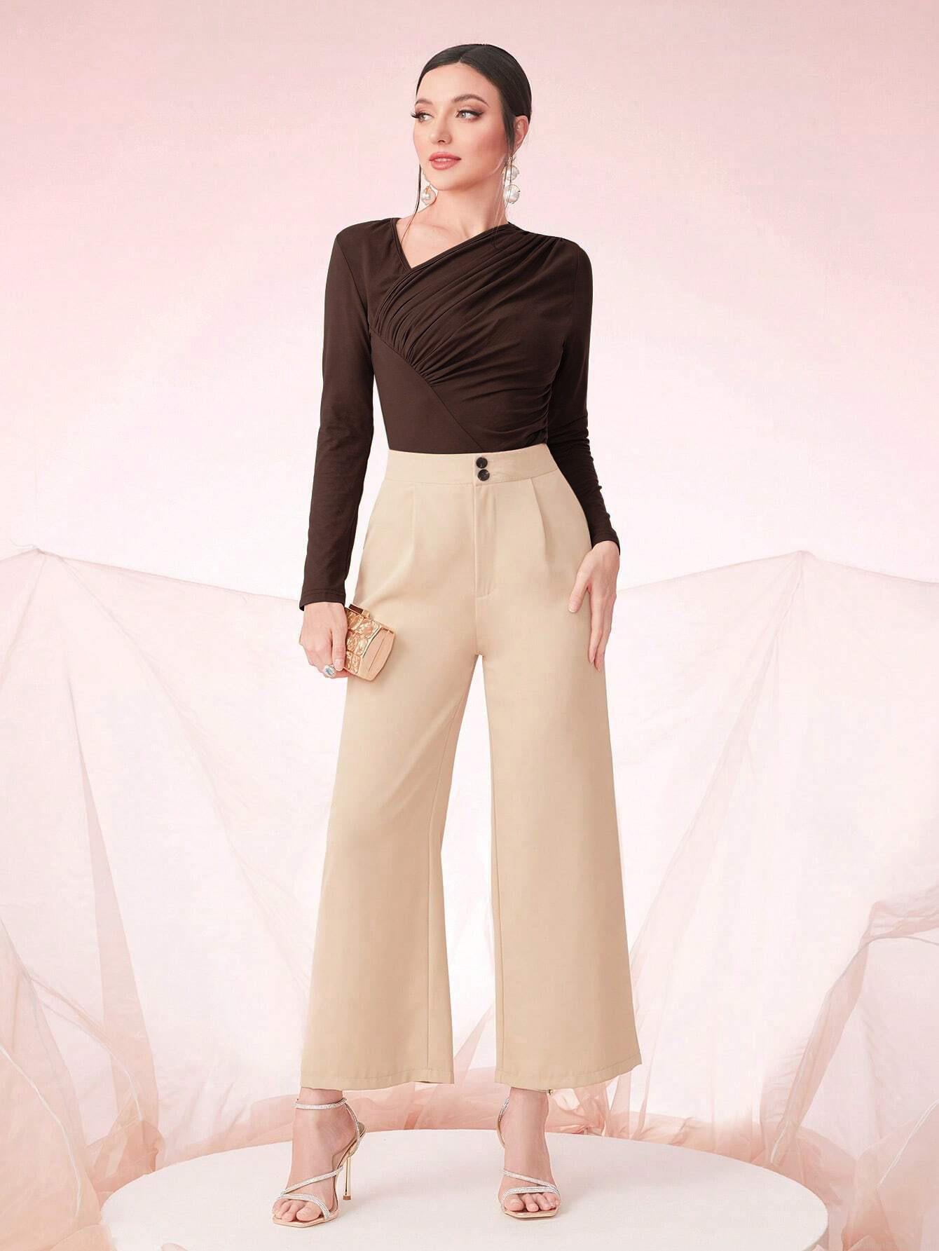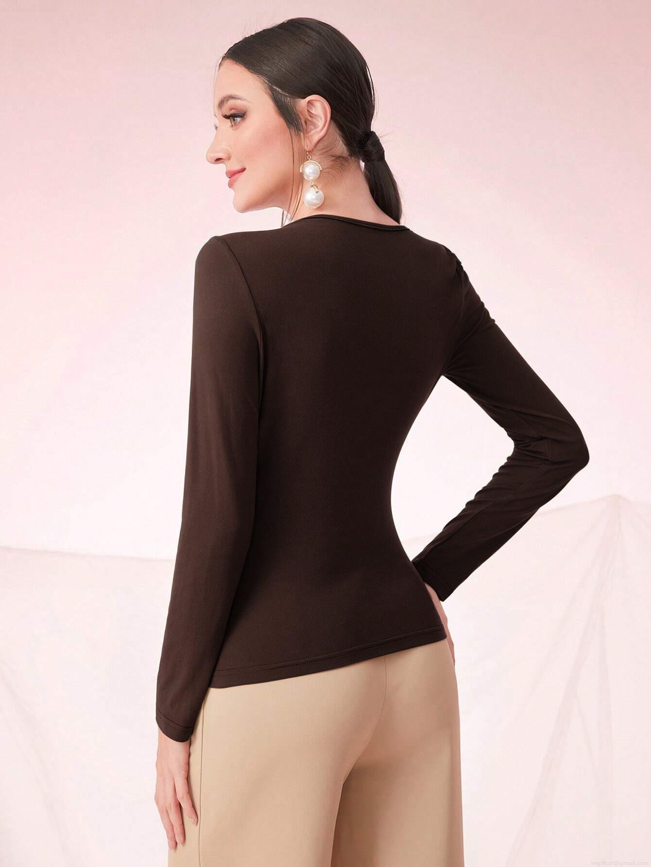 Women's Asymmetric Ruched Long Sleeve T-Shirt Elegant Oblique Neck Slim Fit Solid Color Base Layer Top Coffee Brown Viscose Elastane Pullover For Office Ladies