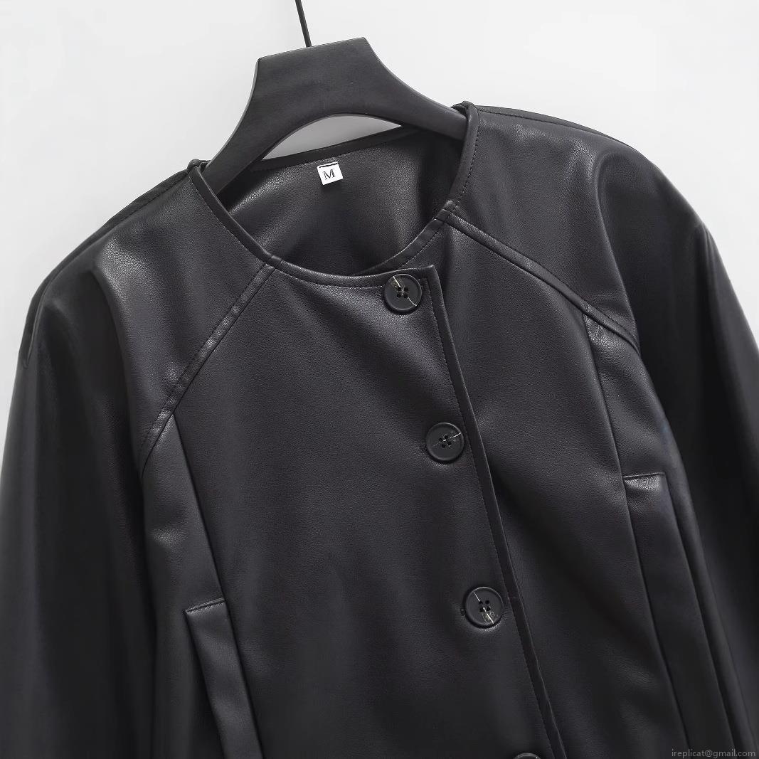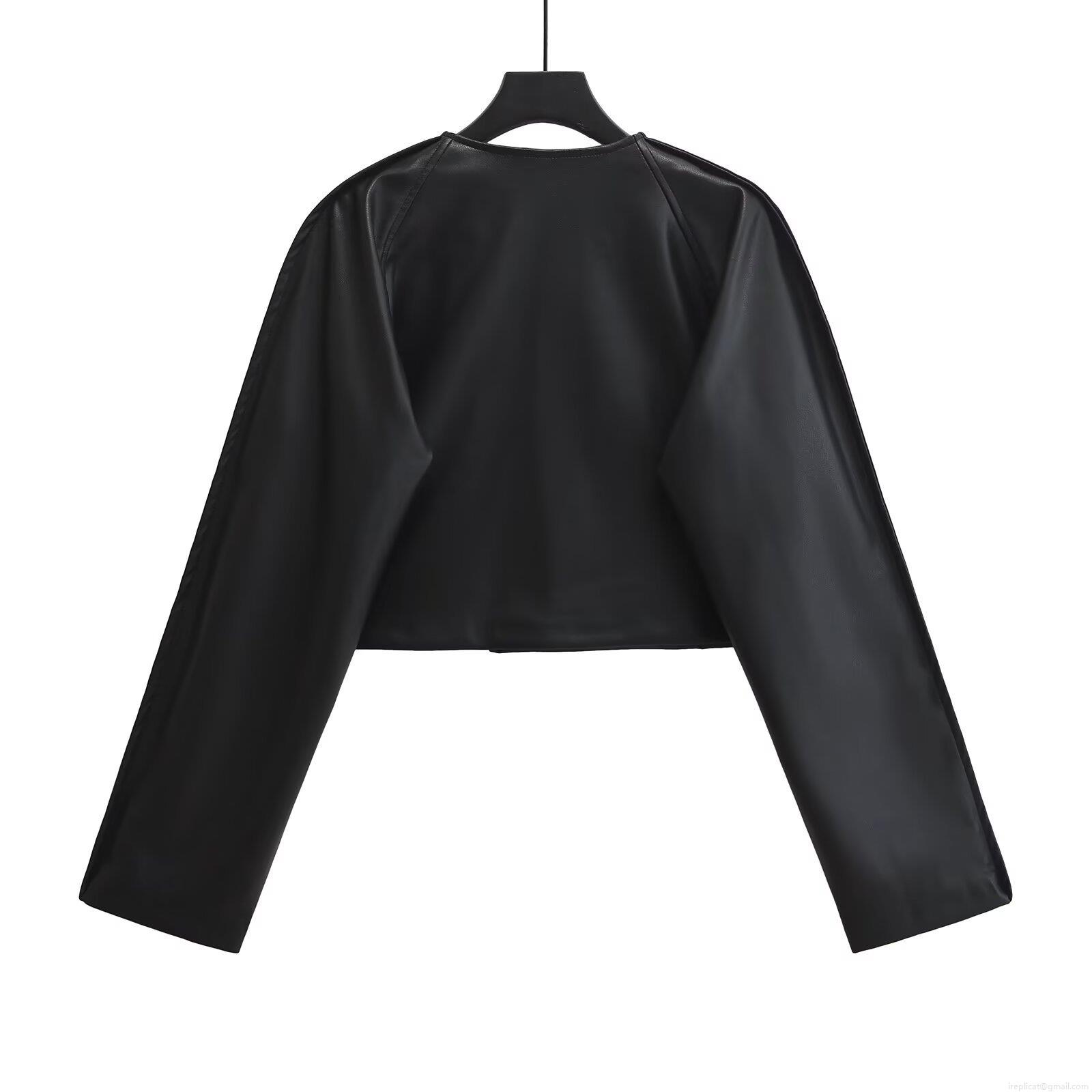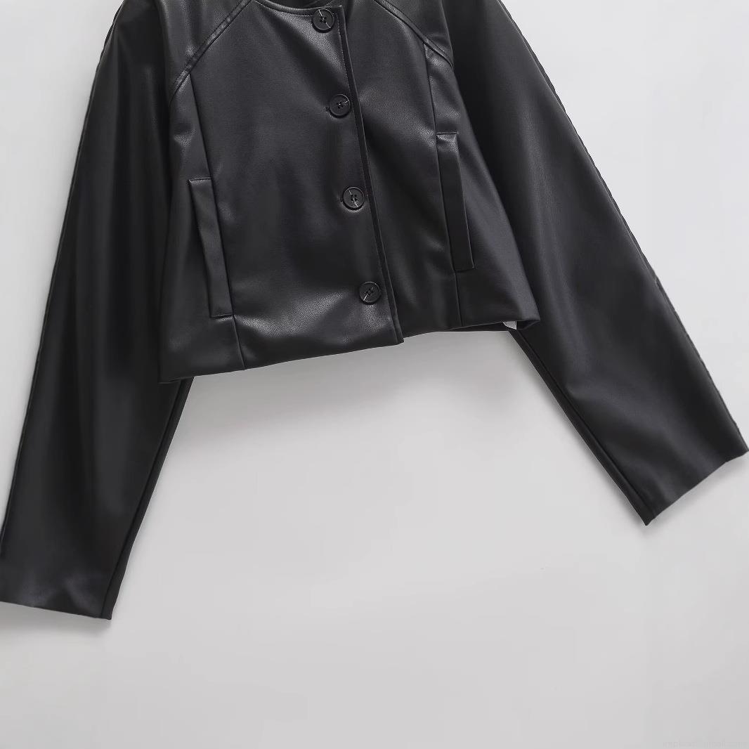 Women's Black Faux Leather Jacket Short Cropped PU Outerwear Round Neck Single Breasted Loose Fit Casual Streetwear Fashion Moto Coat For Ladies