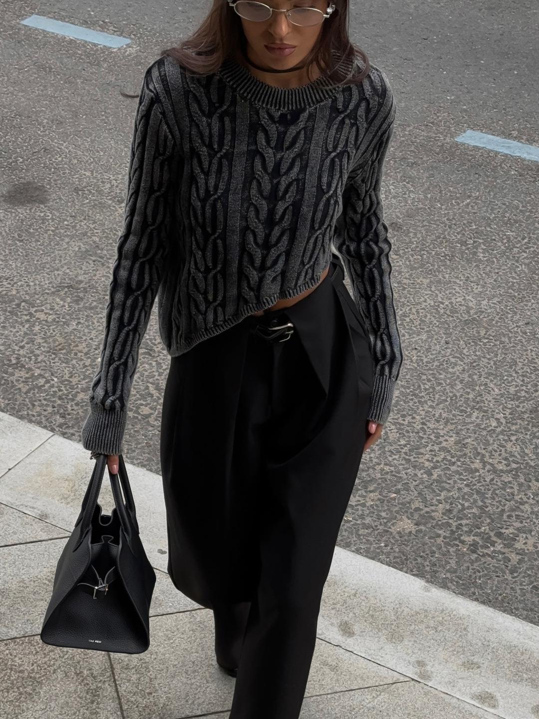 Women's Cable Knit Crop Sweater Long Sleeve Round Neck Washed Distressed Irregular Hem Pullover Loose Fit Cotton Blend Knitted Top Fall Winter Casual Streetwear Minimalist Fashion