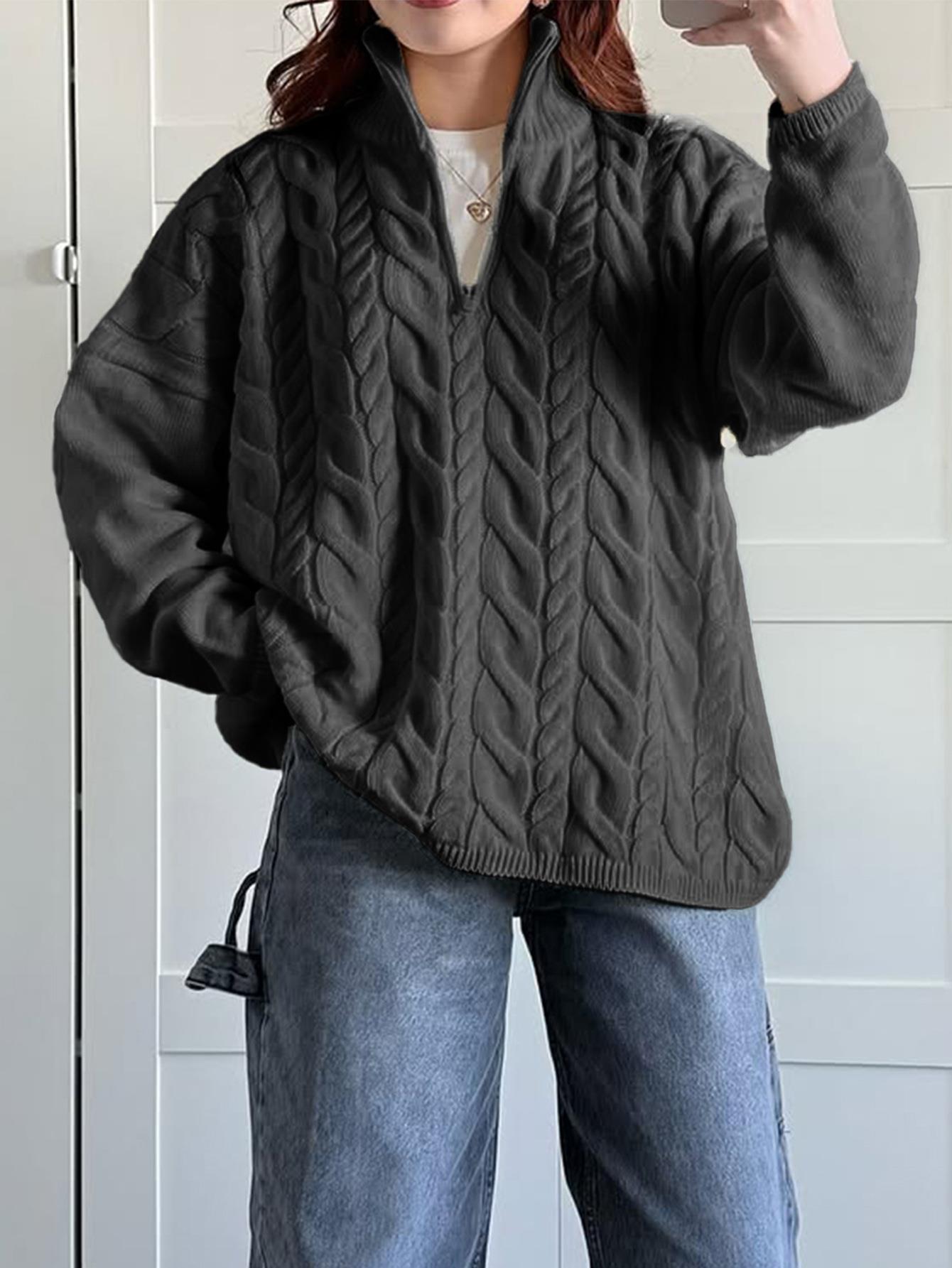 Women's Cable Knit Sweater Half Zip Mock Neck Loose Fit Solid Color Polyester Acrylic Blend Long Sleeve Jumper For Casual Vacation Autumn Winter