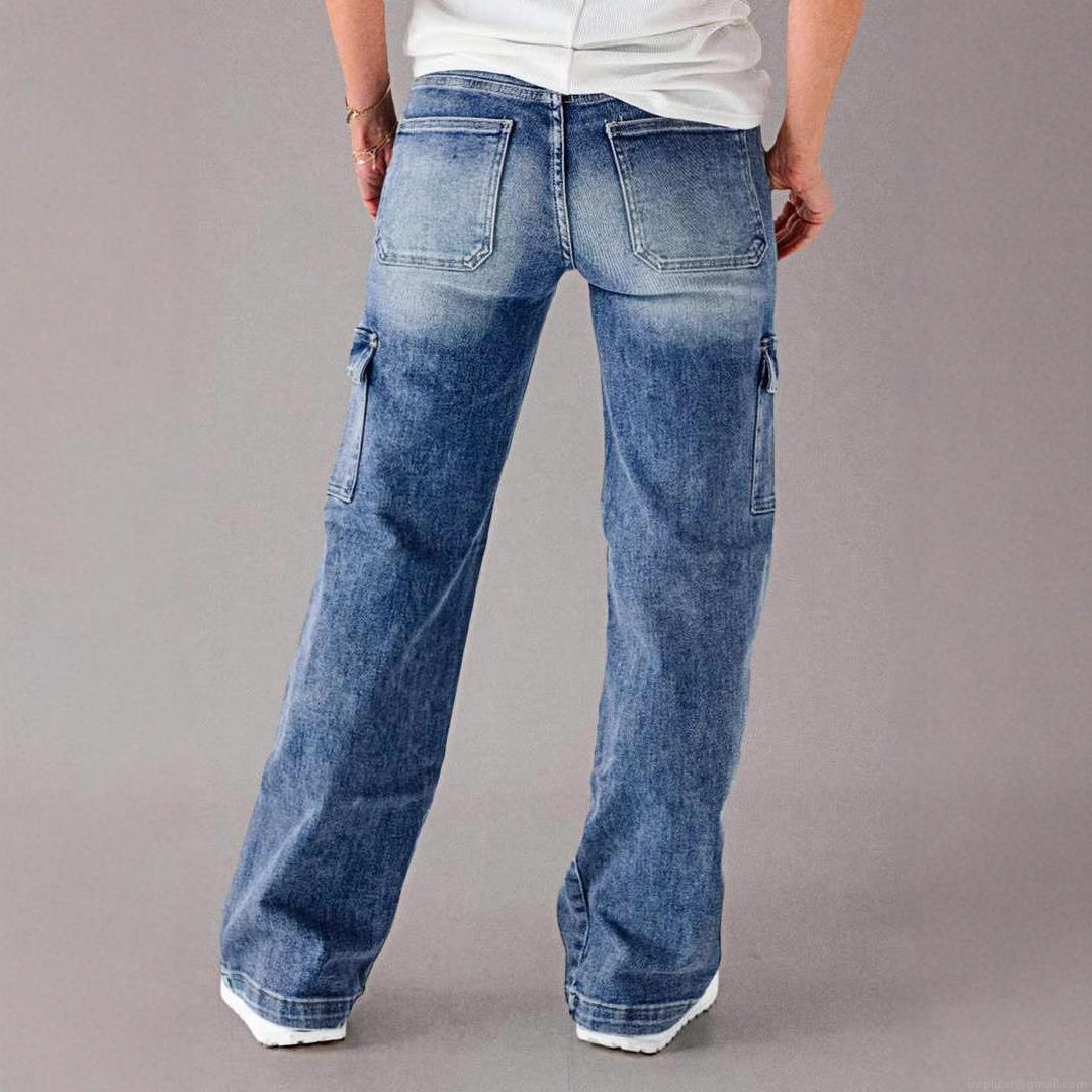Women's Cargo Denim Jeans Loose Straight Leg Washed Blue Pants With Drawstring Waist Casual Streetwear Cotton Blend Multi Pocket Trousers For Women