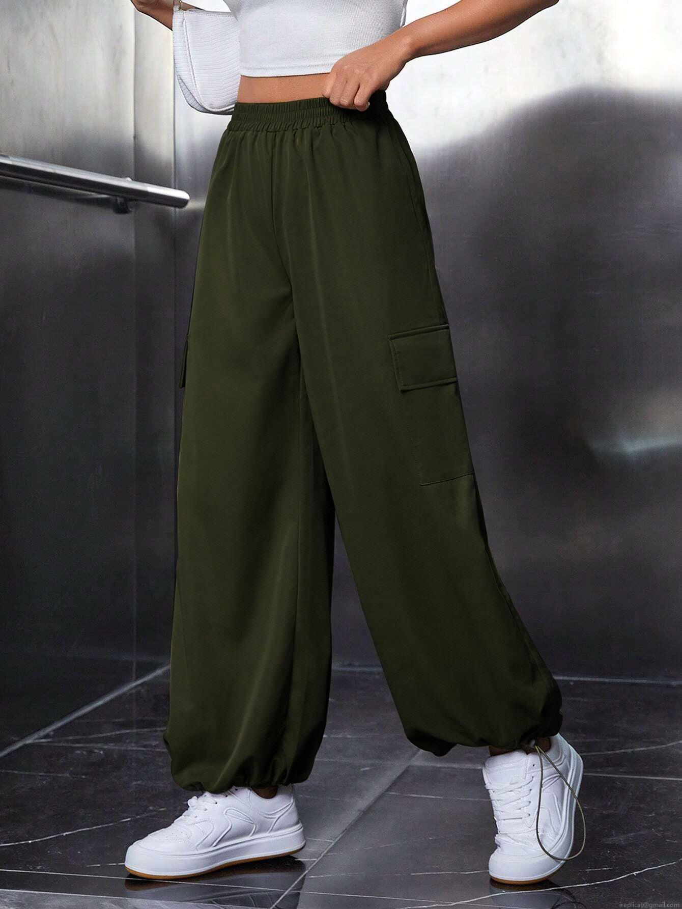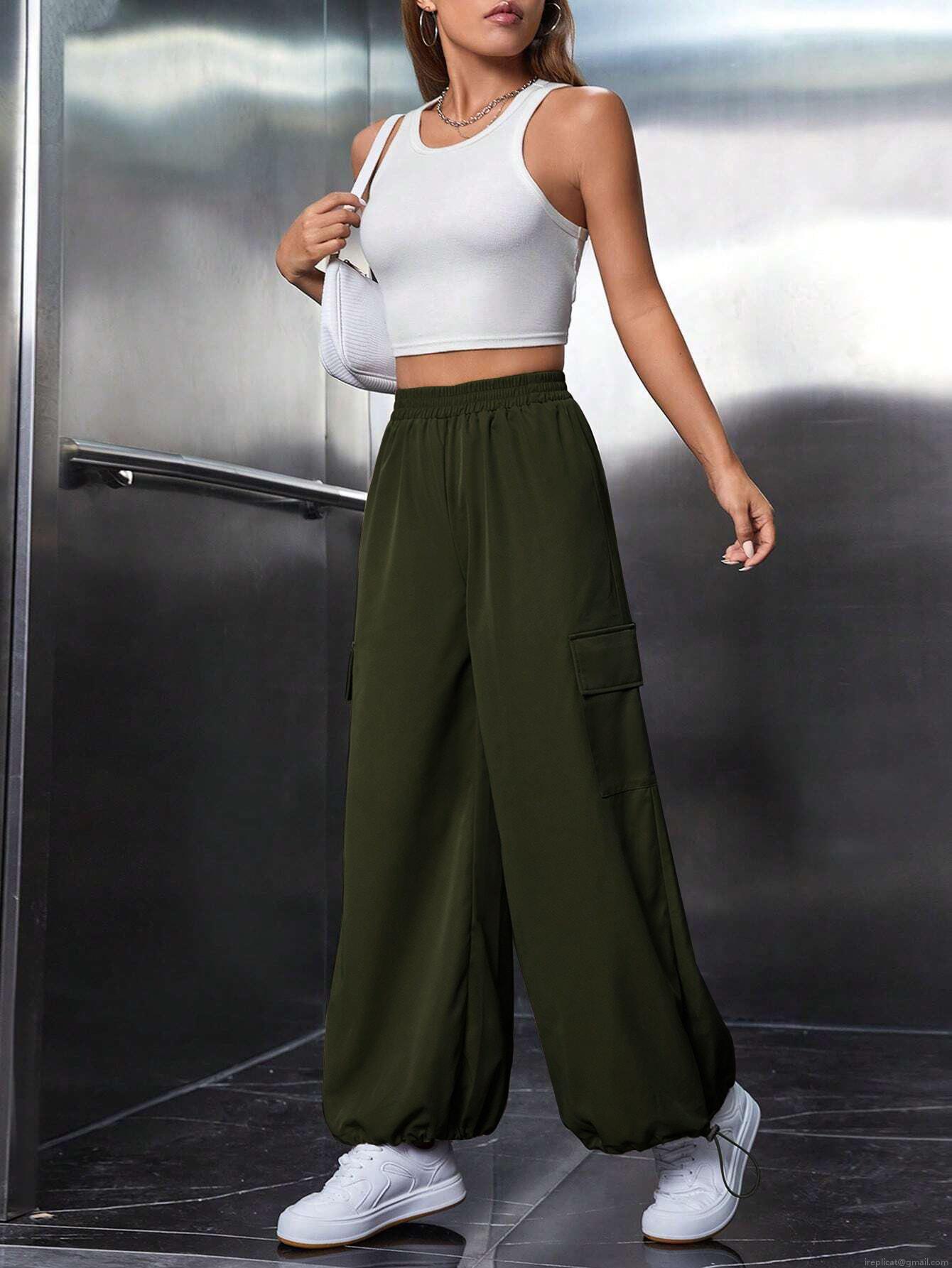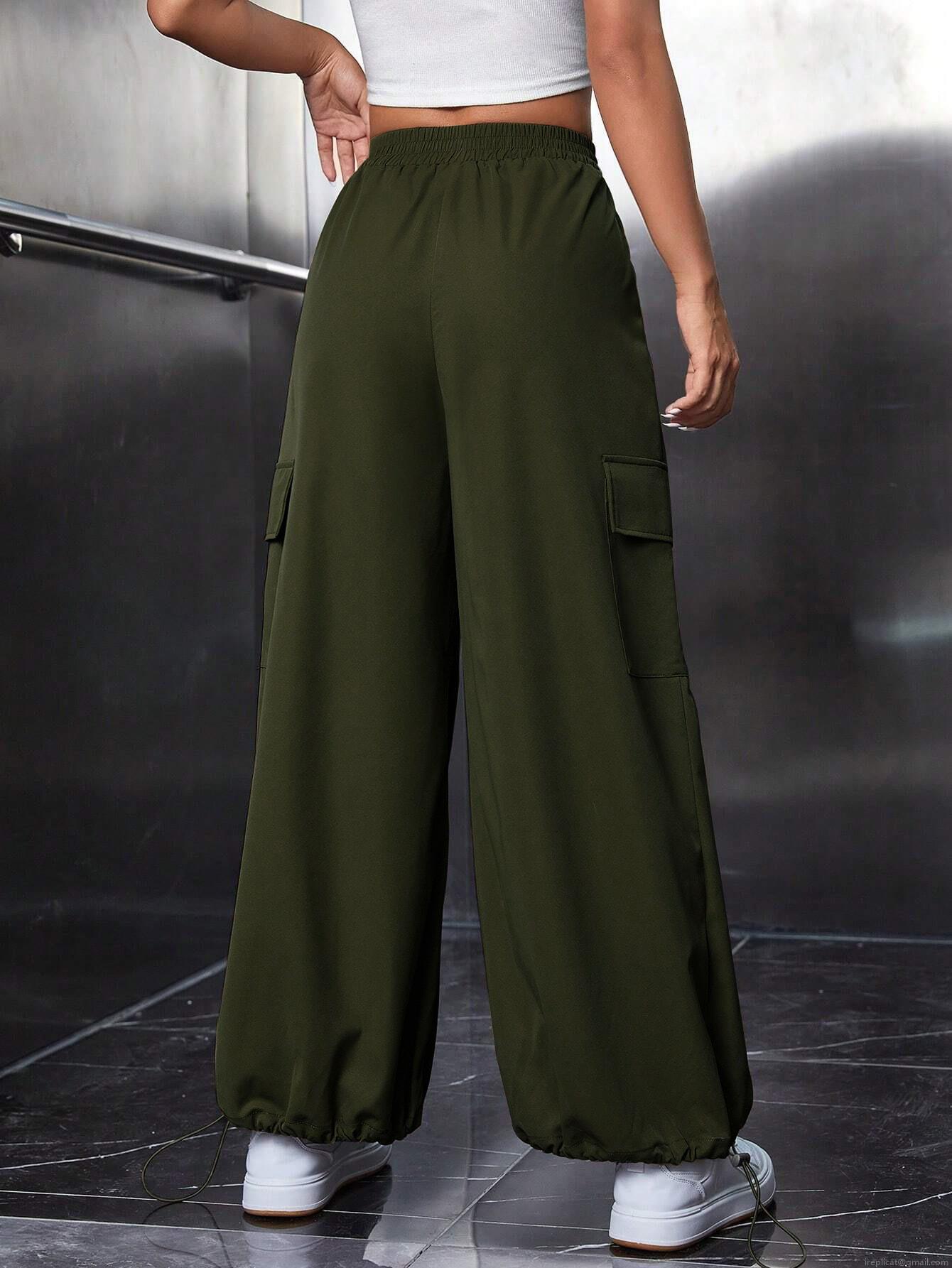 Women's Cargo Pants 100% Polyester Wide Leg Baggy Trousers Elastic Waist Drawstring Hem Multi-Pocket Utility Streetwear Casual Military Green Pants For Women