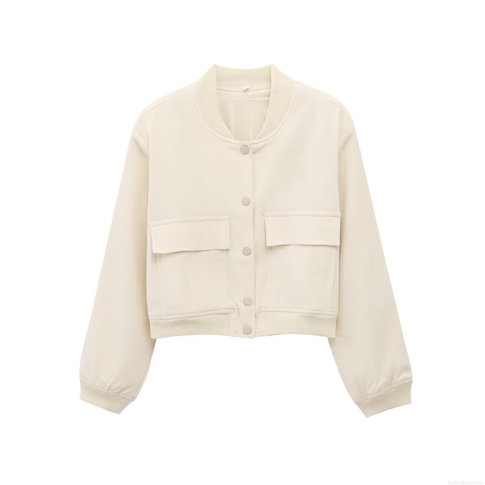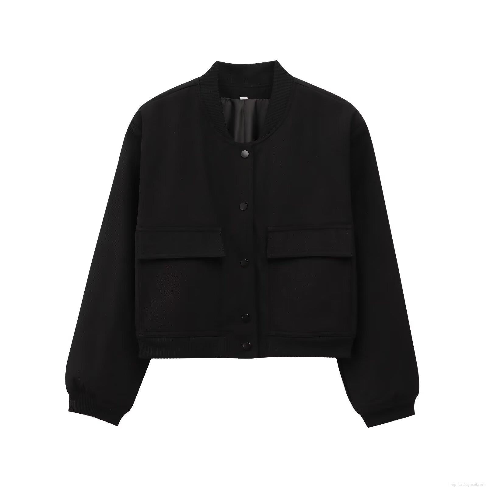 Women's Casual Academic Style Short Bomber Jacket Single Breasted Metal Buttons Ribbed Cuffs Hem Two Big Flap Pockets Streetwear Outerwear