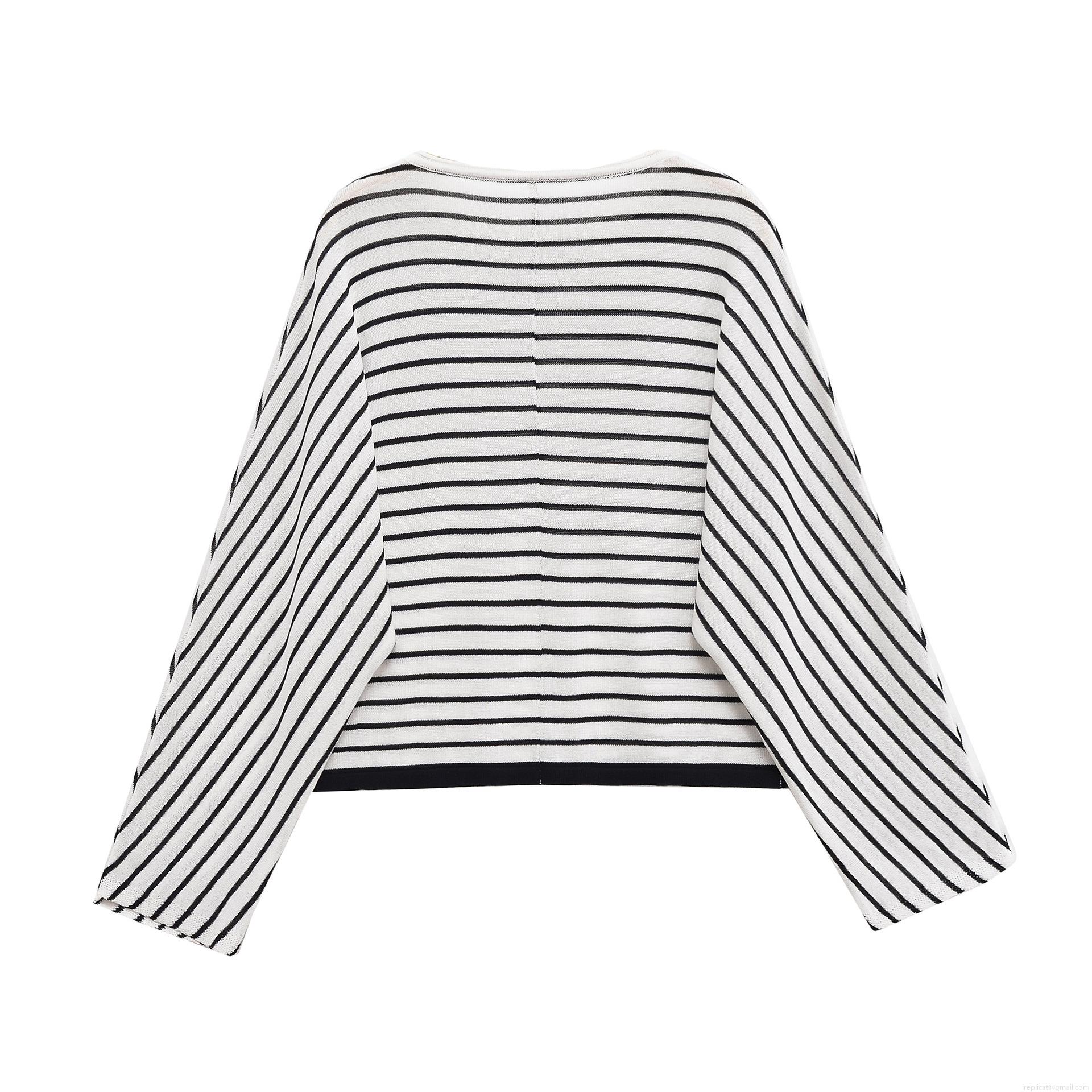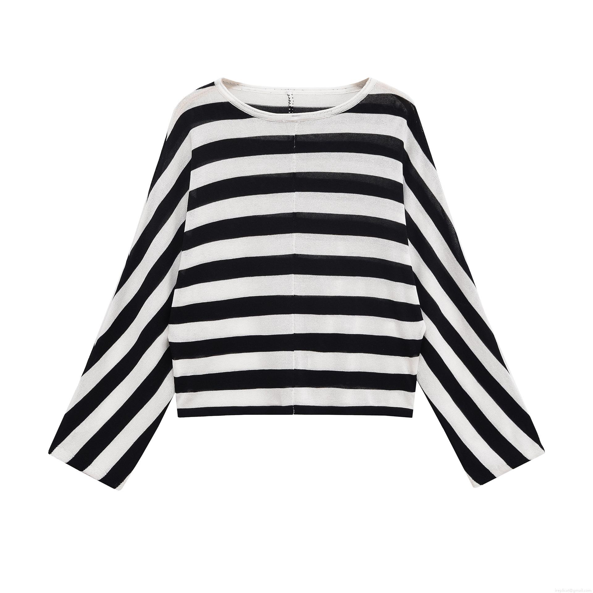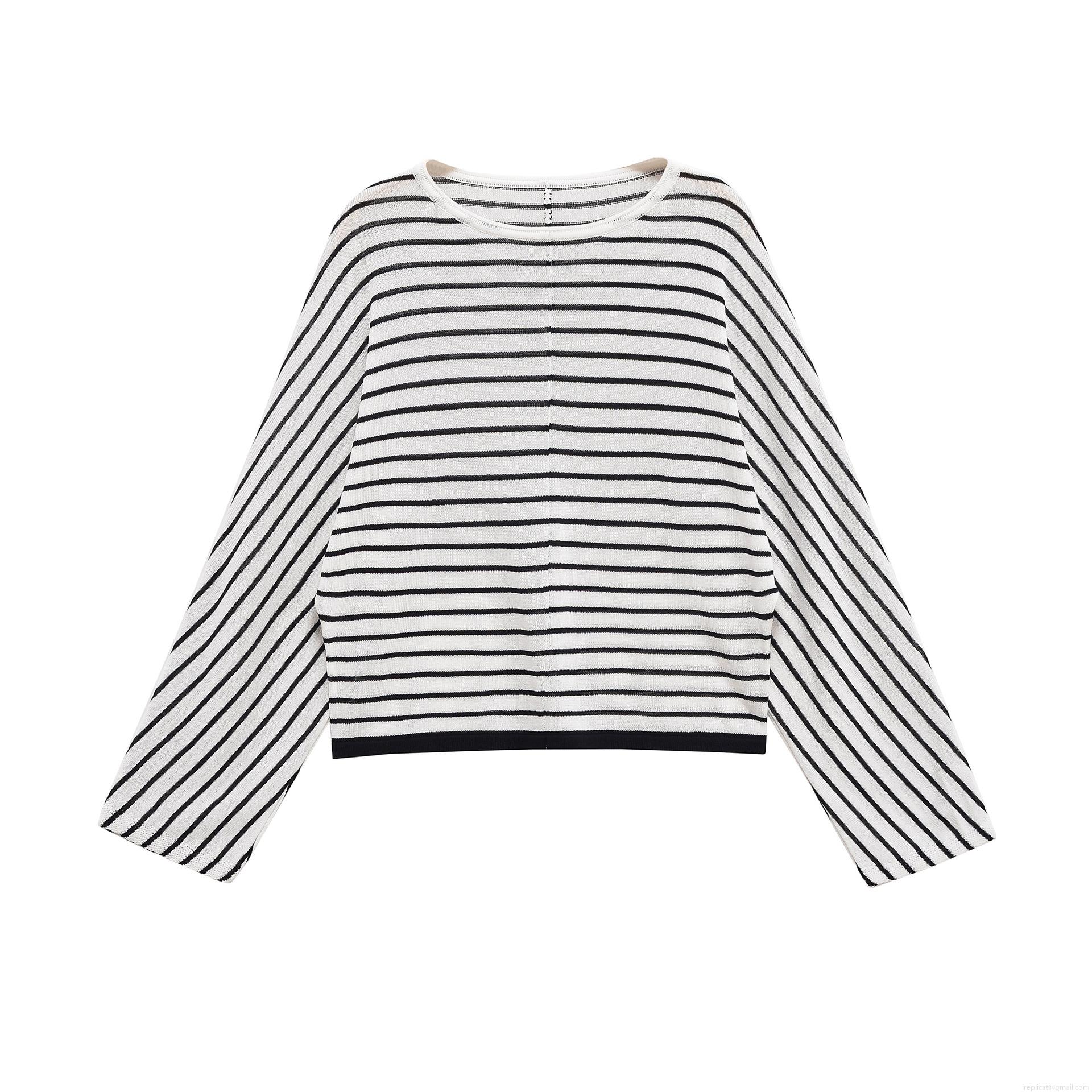 Women's Casual Black And White Striped Knit Top Round Neck Loose Batwing Sleeve Polyester Long Sleeve Pullover T-Shirt For Daily Streetwear