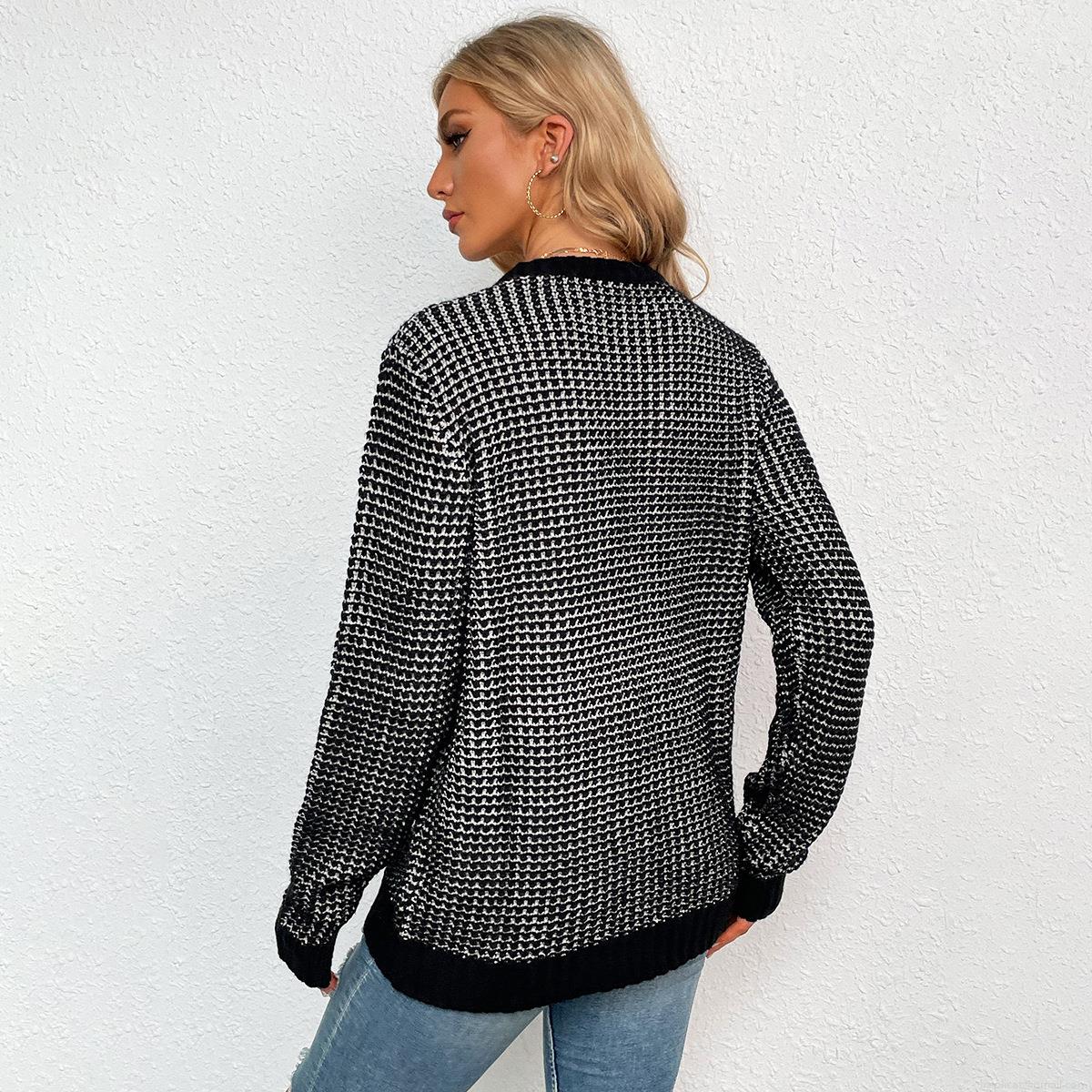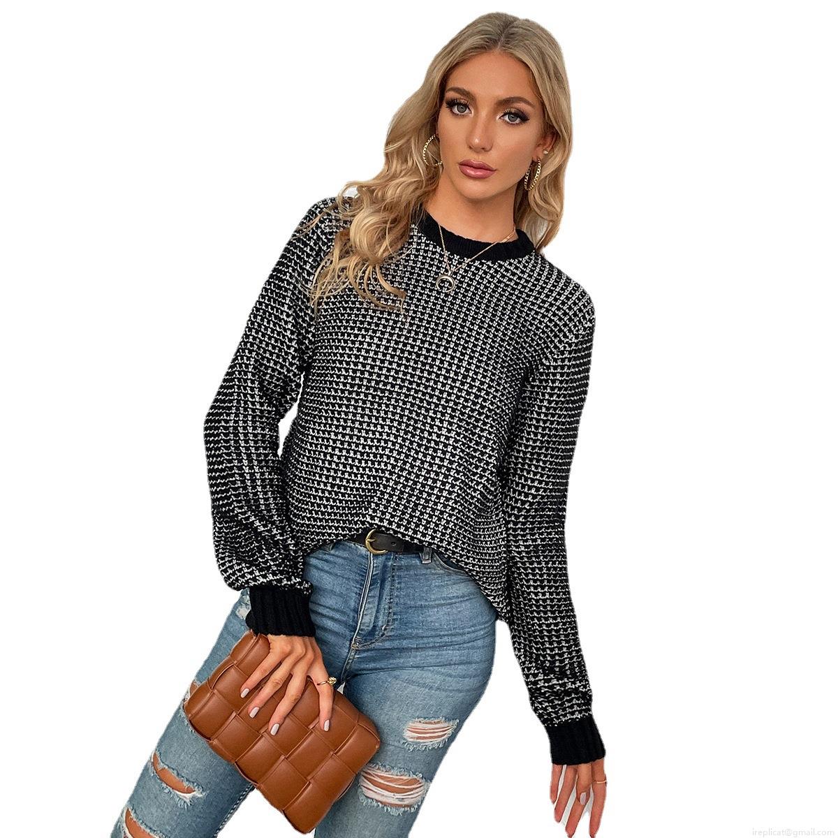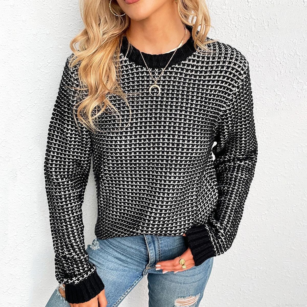 Women's Casual Black White Checkered Knit Sweater Round Neck Long Sleeve Color Block Pullover Top For Daily Office Wear Autumn Winter British Style Fashionable Loose Fitting Polyester Knitwear