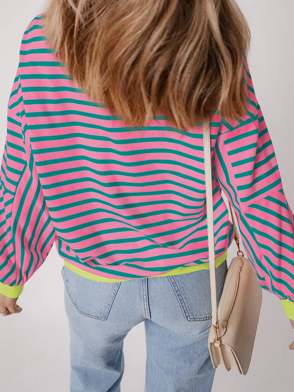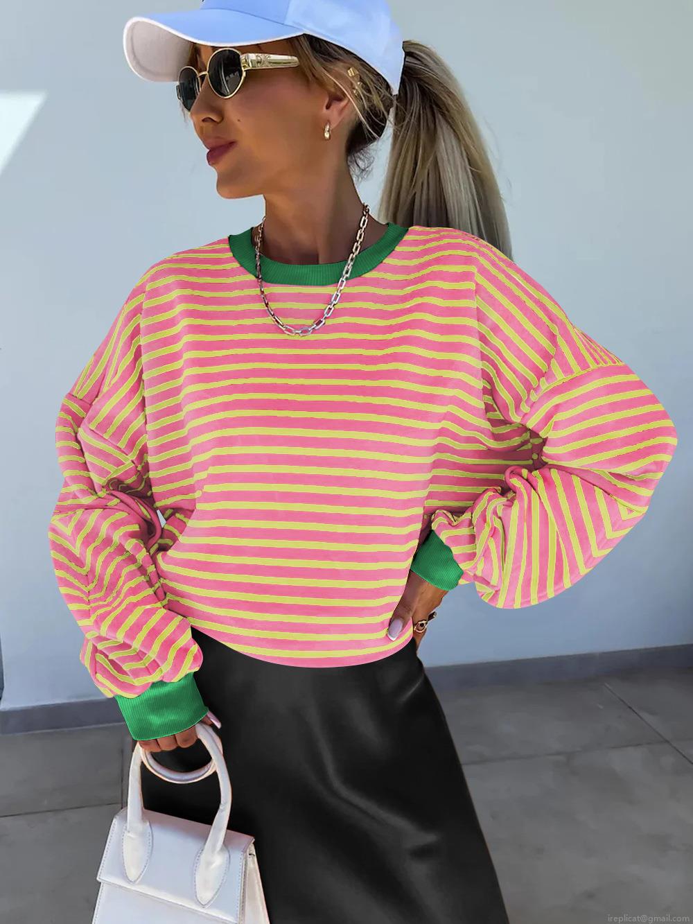 Women's Casual Color Block Striped Long Sleeve Sweatshirt Crewneck Loose Fit Cotton Blend Pullover T-Shirt Top For Autumn Winter