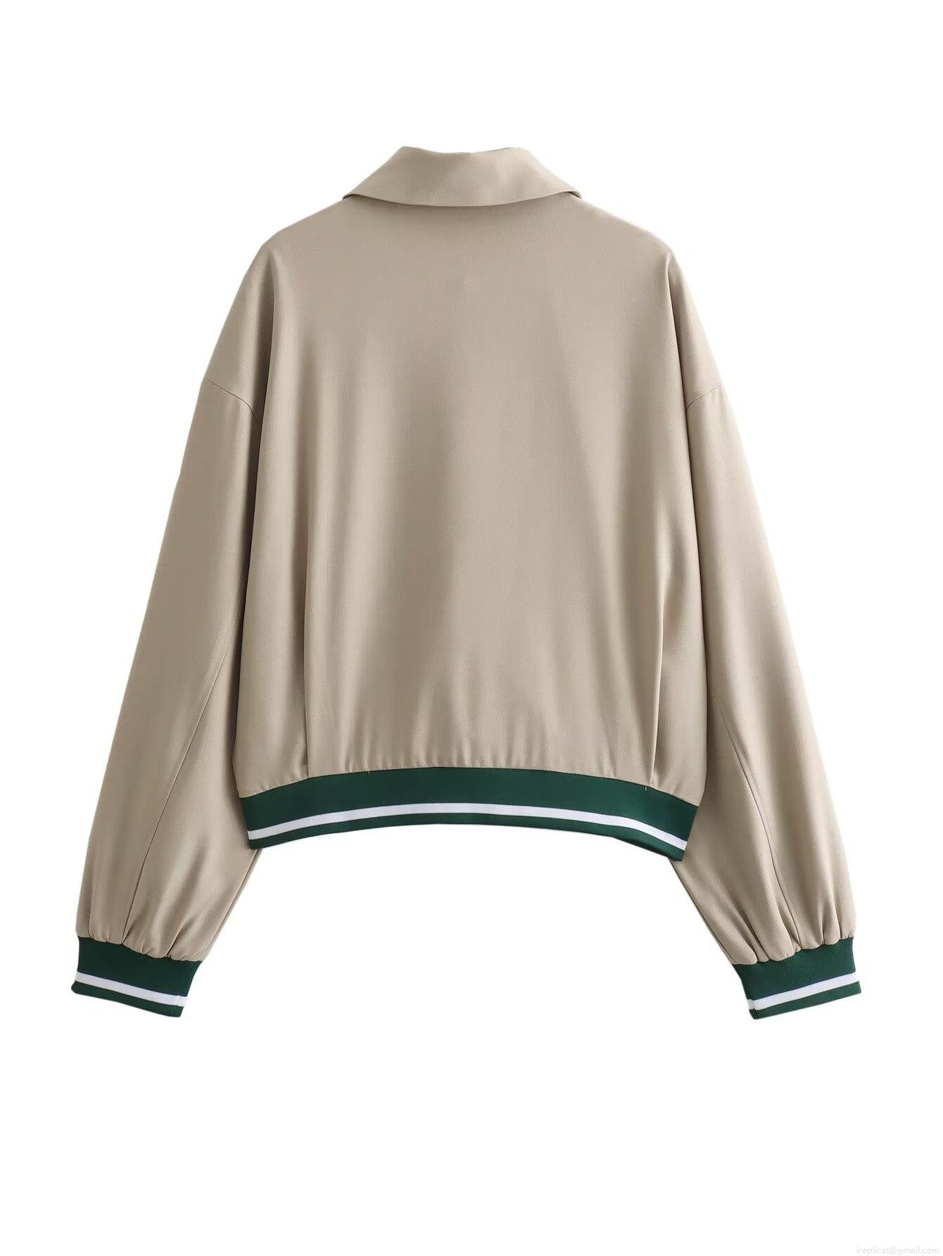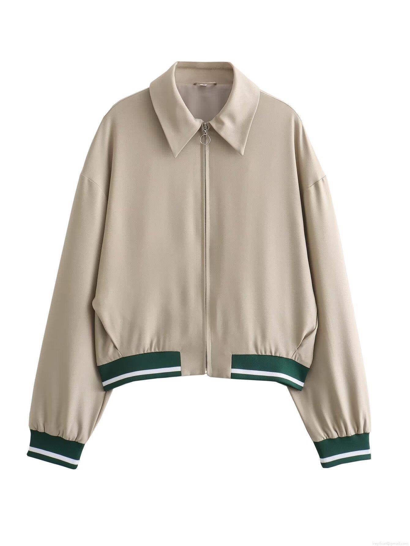 Women's Casual Colorblock Varsity Jacket Loose Turn Down Collar Zip Up Baseball Flight Jacket With Striped Rib Trim Polyester Outerwear For Autumn
