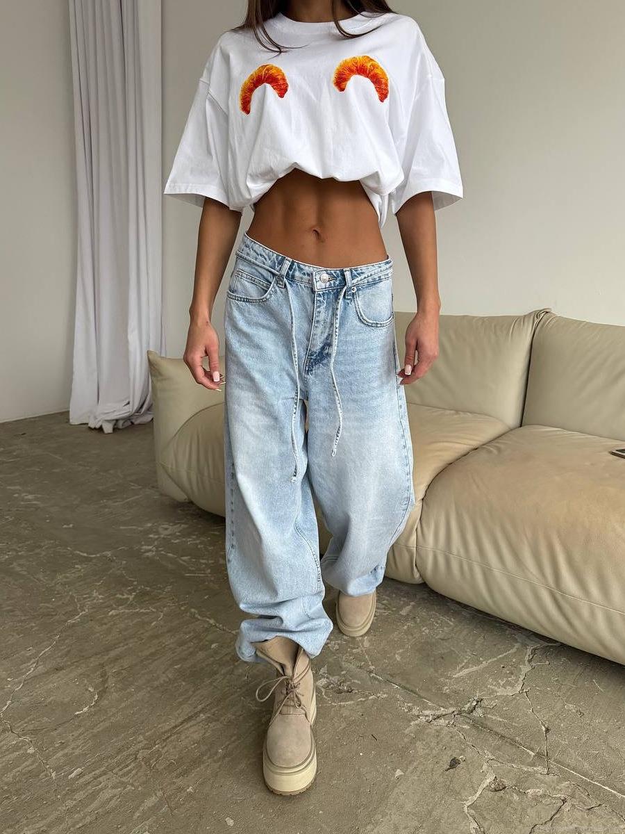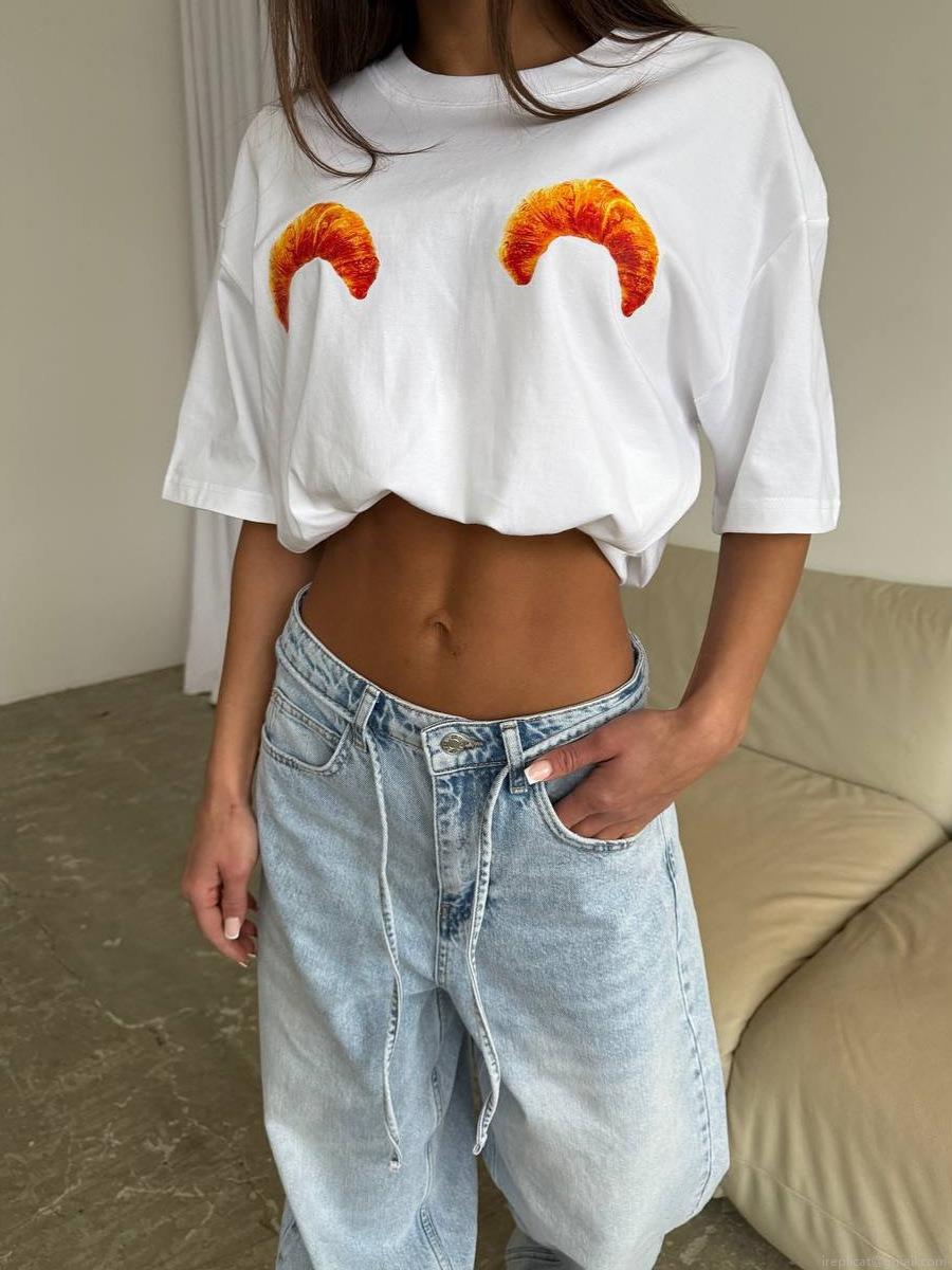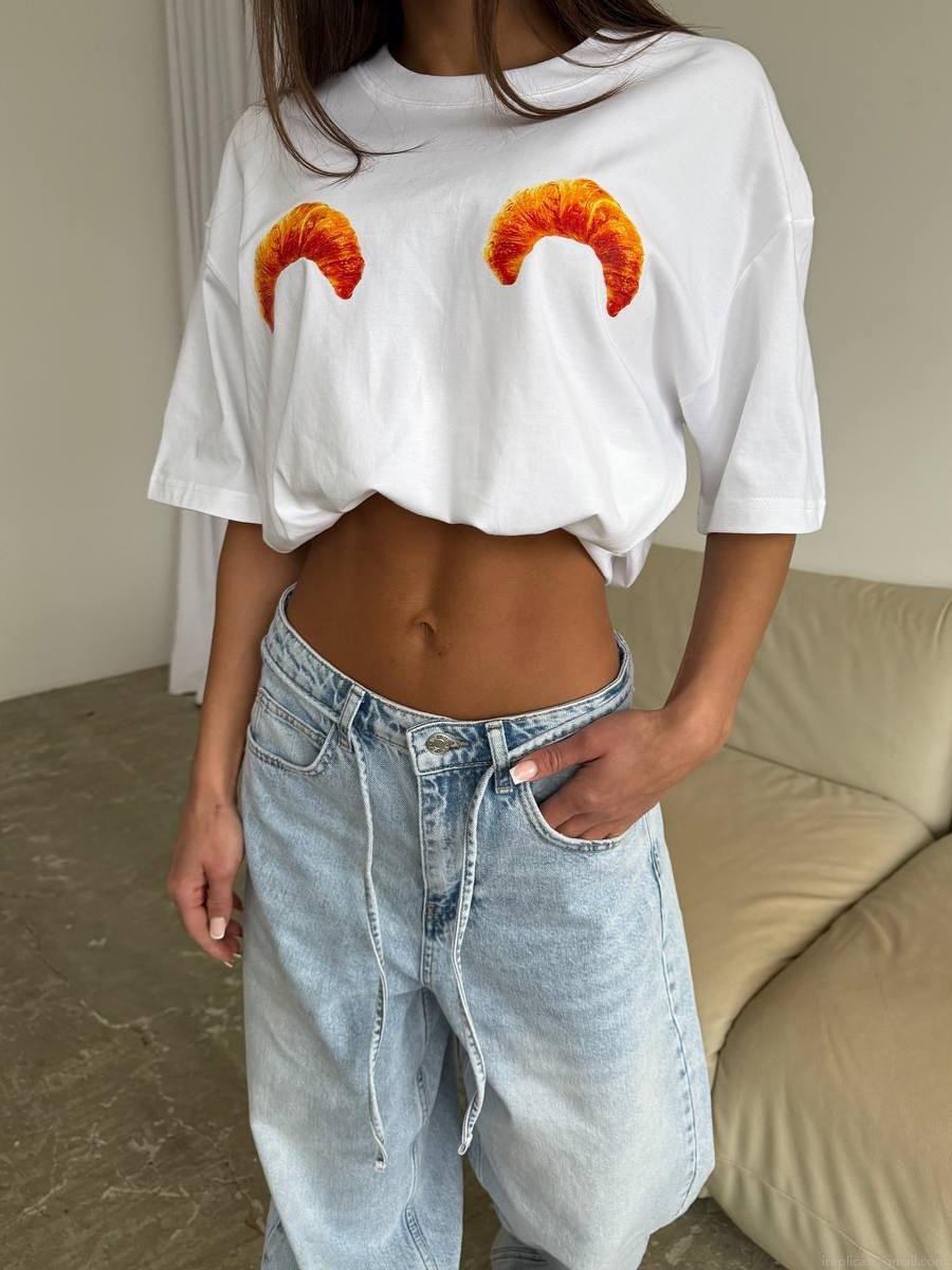 Women's Casual Cotton Blend T-Shirt Funny Croissant Print Oversized Short Sleeve Drop Shoulder Round Neck Tee Streetwear Loose Fit Summer Top For Women