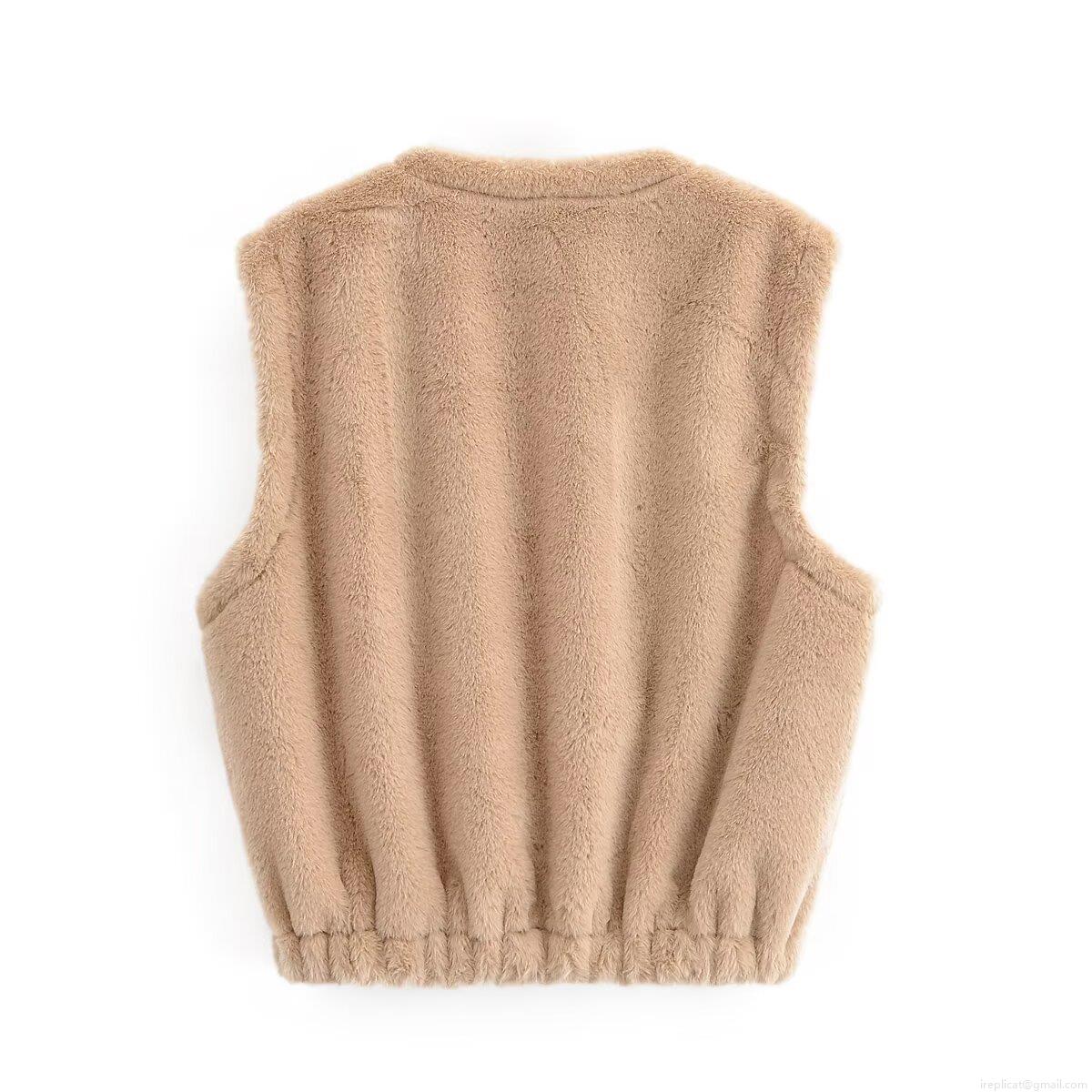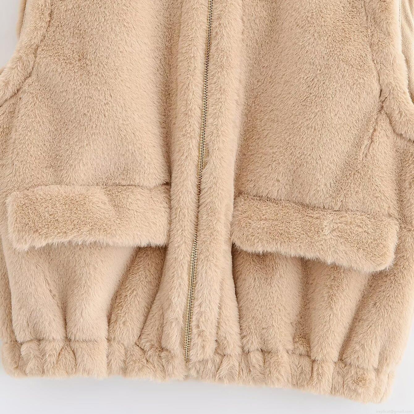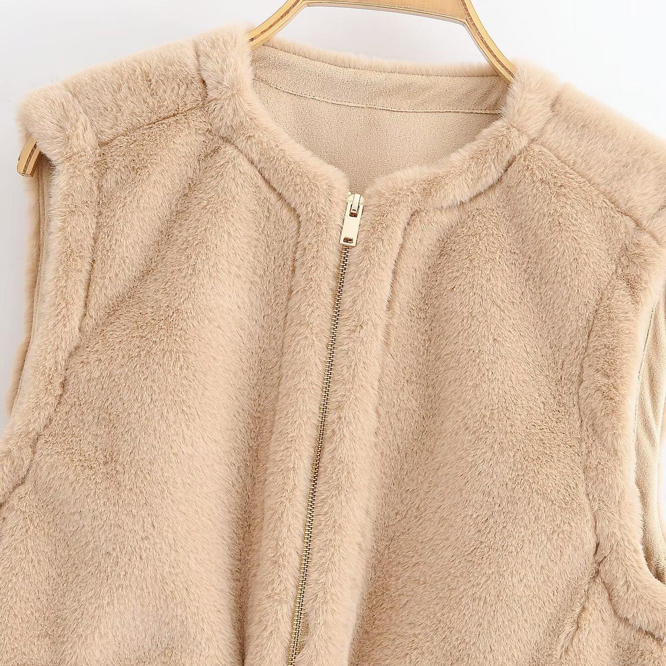 Women's Casual Faux Fur Vest Round Neck Sleeveless Zip Up Waistcoat Warm Winter Solid Color Plush Outerwear Jacket For Ladies