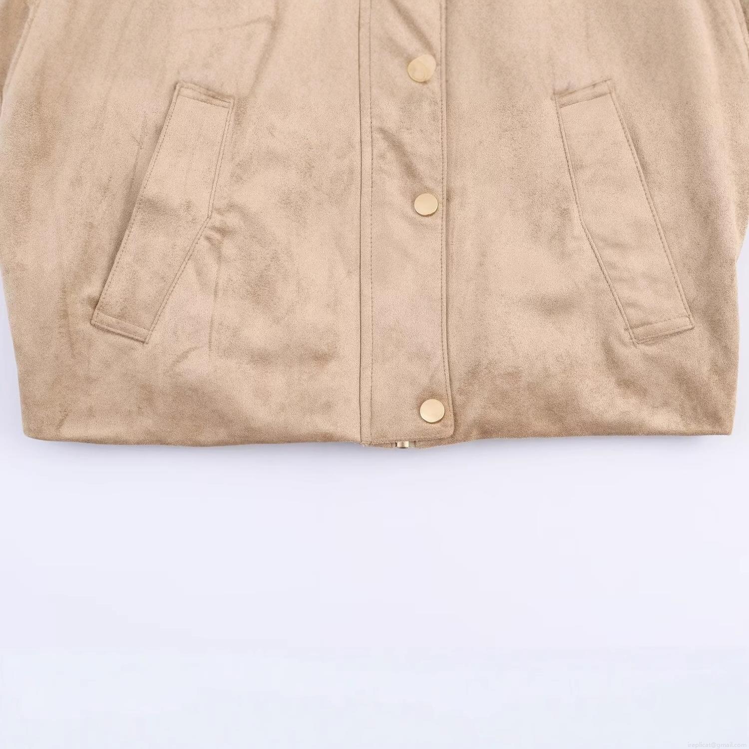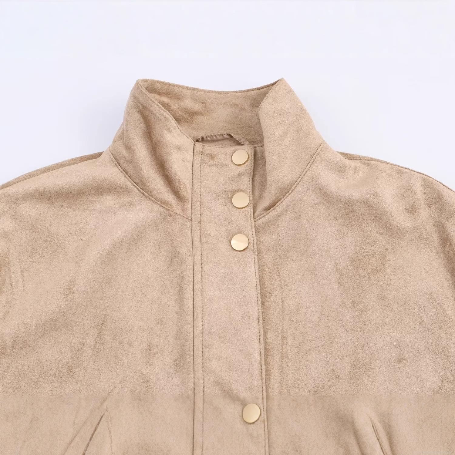 Women's Casual Faux Suede Jacket Stand Collar Loose Long Sleeve Coat Khaki Streetwear Outerwear With Gold Metal Buttons For Spring Autumn